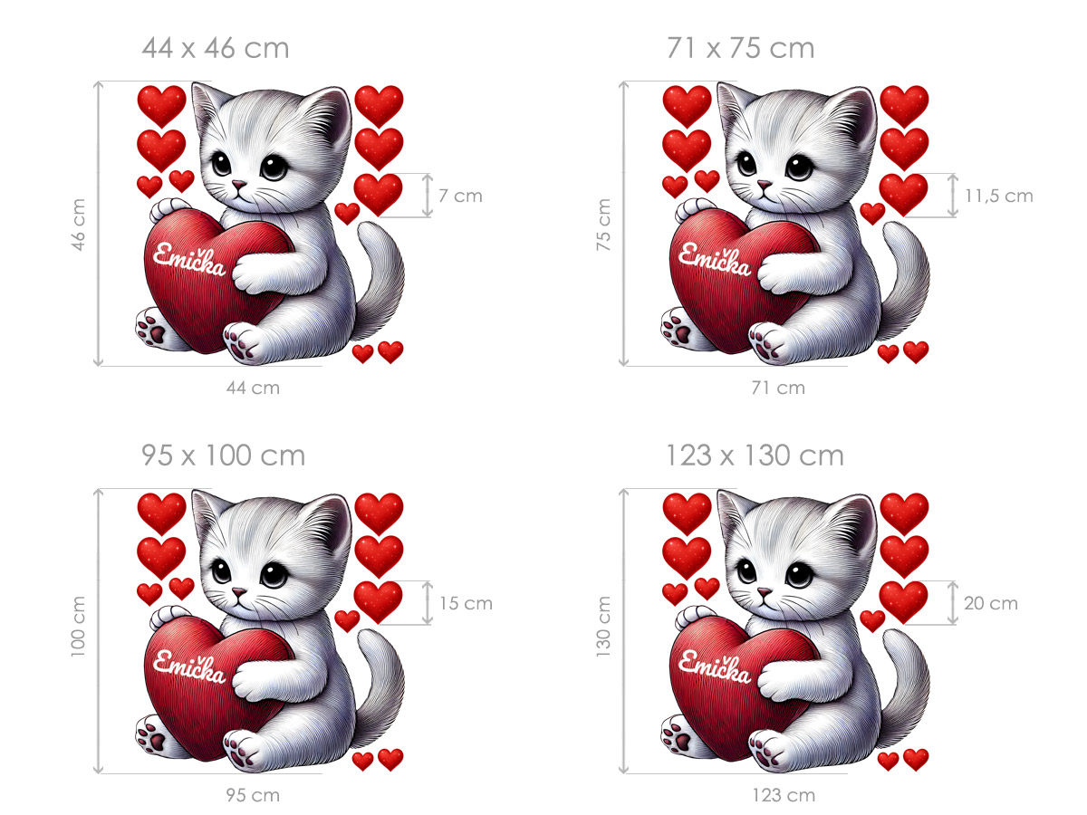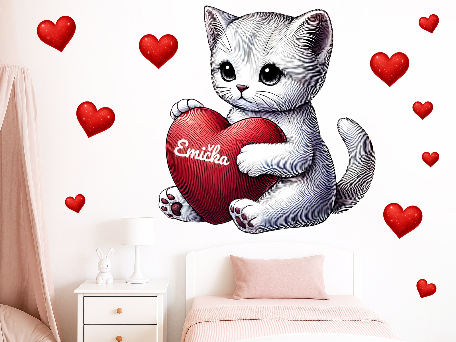 Jméno na přání v srdíčku lze samotné nebo kombinovat s datem narození nebo například věkem (tento údaj bude vycentrován pod jménem ve druhém řádku). Text zadejte ve 3. kroku objednávky do pole "poznámka". Máte-li speciální přání kontaktujte nás: info@nalepte.cz. Bude Vám zaslán náhled ke schválení emailem. Samolepka na zeď „Koťátko se srdíčkem a jménem na přání“ je dokonalou dekorací do dětského pokojíčku, která vnese něhu, barvy a osobní kouzlo. Roztomilé bílé koťátko s obrovskýma očičkama jemně objímá srdíčko, na které vám vytvoříme jméno podle přání – díky tomu se z dekorace stává jedinečný a originální doplněk. Součástí jsou i samostatná červená srdíčka, která můžete rozmístit dle libosti a vytvořit tak krásnou scénu nad postýlkou či u hracího koutku.