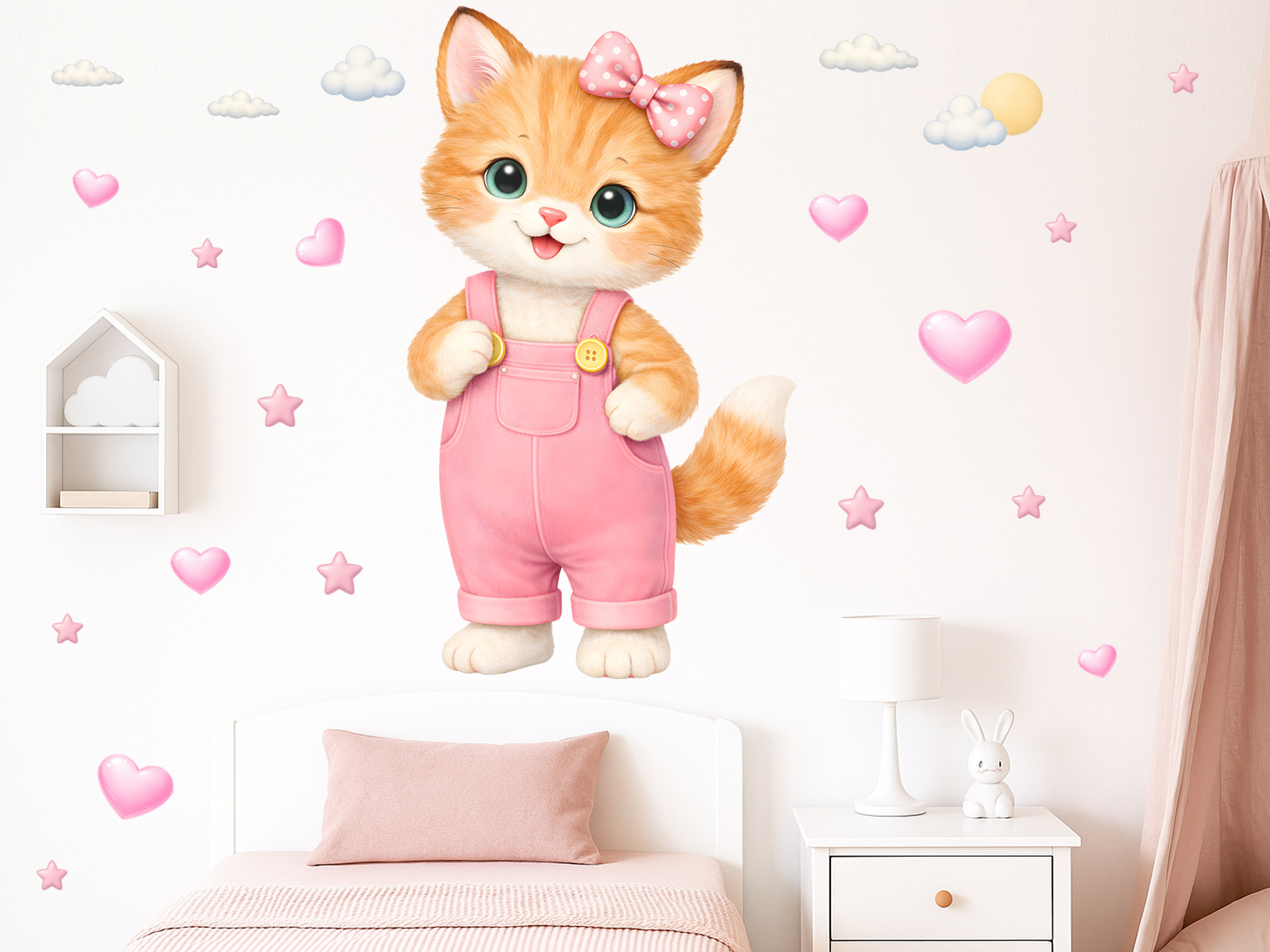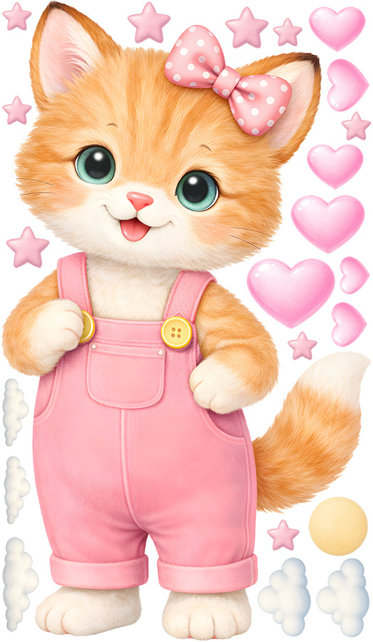 Samolepka na zeď „Koťátko v kalhotách“ vnese do dětského pokoje něžnou, hravou atmosféru plnou radosti a fantazie. Roztomilé koťátko s velkýma zářivýma očima, růžovou mašličkou a kalhotkami působí mile, přátelsky a okamžitě si získá pozornost malých i větších dětí. Motiv je doplněn jemnými dekorativními prvky v podobě srdíček, hvězdiček, obláčků a sluníčka, které vytvářejí lehký, pohádkový dojem a podporují pocit bezpečí a klidu. Harmonická pastelová barevnost se snadno sladí s interiérem dětského pokoje a dodá prostoru teplo, útulnost a pozitivní náladu. Součástí produktu je arch se samolepkou a náhledová vizualizace, která ukazuje, jak jemně a přirozeně motiv působí na stěně v reálném prostředí.