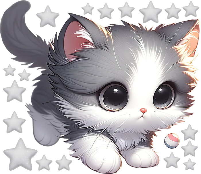 Rozkošné šedobílé kotě s velkýma kukadly přinese do dětského pokojíčku něhu a radost. Tato sada samolepek na zeď je ideální pro všechny malé milovníky zvířátek – působí jemně, hravě a zároveň elegantně. Díky pastelovým barvám a měkkým přechodům se perfektně hodí do světlých interiérů i pokojů ve skandinávském stylu. Součástí archu jsou také hvězdičky a hrací míček, které dotvářejí atmosféru snového dětského světa.