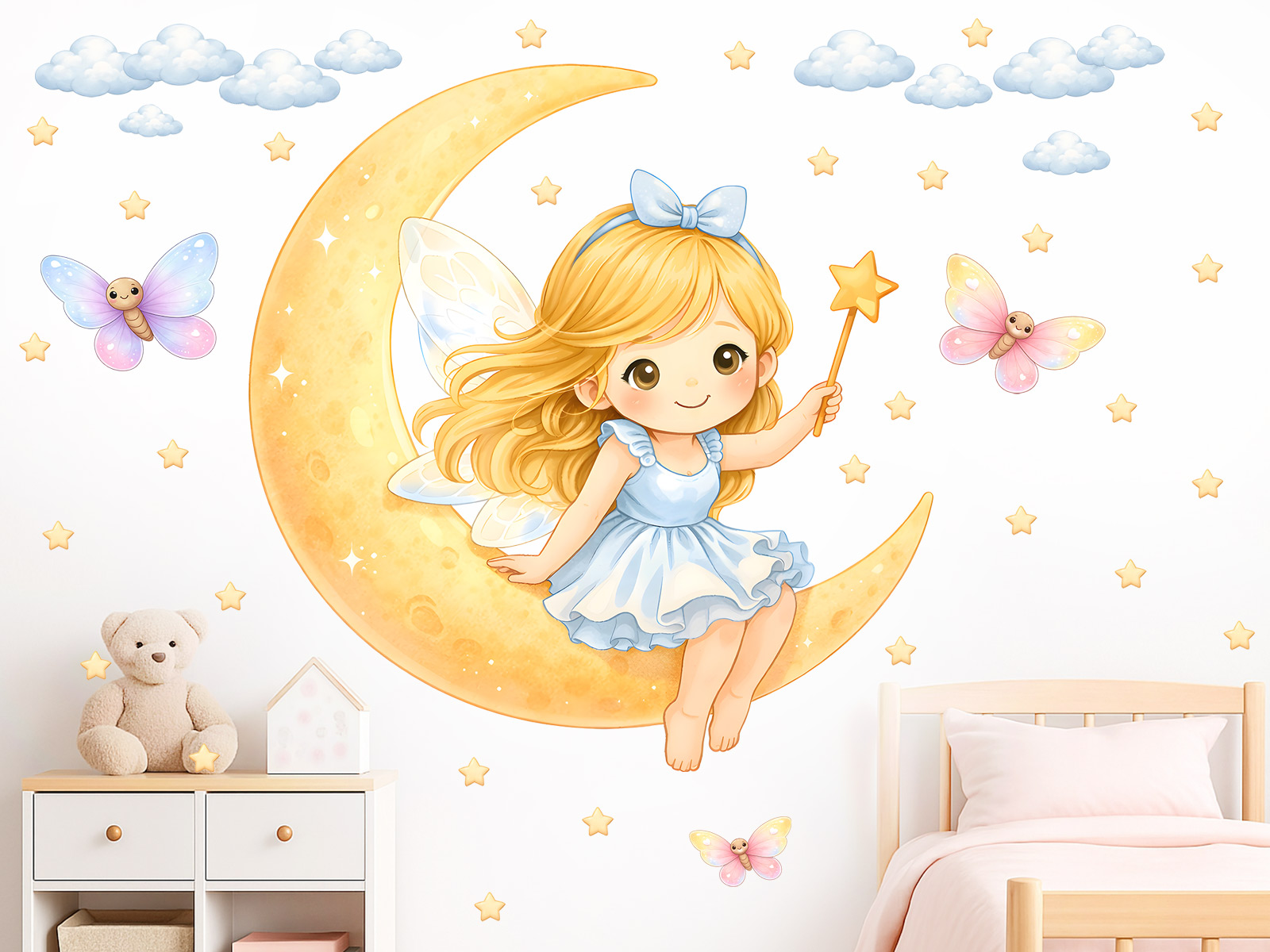 Samolepky na zeď „Kouzelná víla a měsíc“ přenesou dětský pokoj do pohádkového světa plného klidu, snění a jemné magie. Roztomilá víla sedící na zlatavém měsíci, obklopená hvězdičkami, obláčky a motýlky, vytváří hřejivou a uklidňující atmosféru, ideální zejména pro holčičí pokoj nebo prostor určený k odpočinku a usínání. Jemné pastelové barvy, měkké linie a přátelský výraz víly působí harmonicky a nenápadně doplní interiér bez rušivého efektu. Samolepky jsou navrženy tak, aby šly snadno aplikovat i kombinovat podle vlastní fantazie a krásně vynikly nad postýlkou, postelí nebo v herním koutku. Výsledkem je kouzelná dekorace, která podporuje dětskou představivost, navozuje pocit bezpečí a promění pokojíček v místo plné snových příběhů.