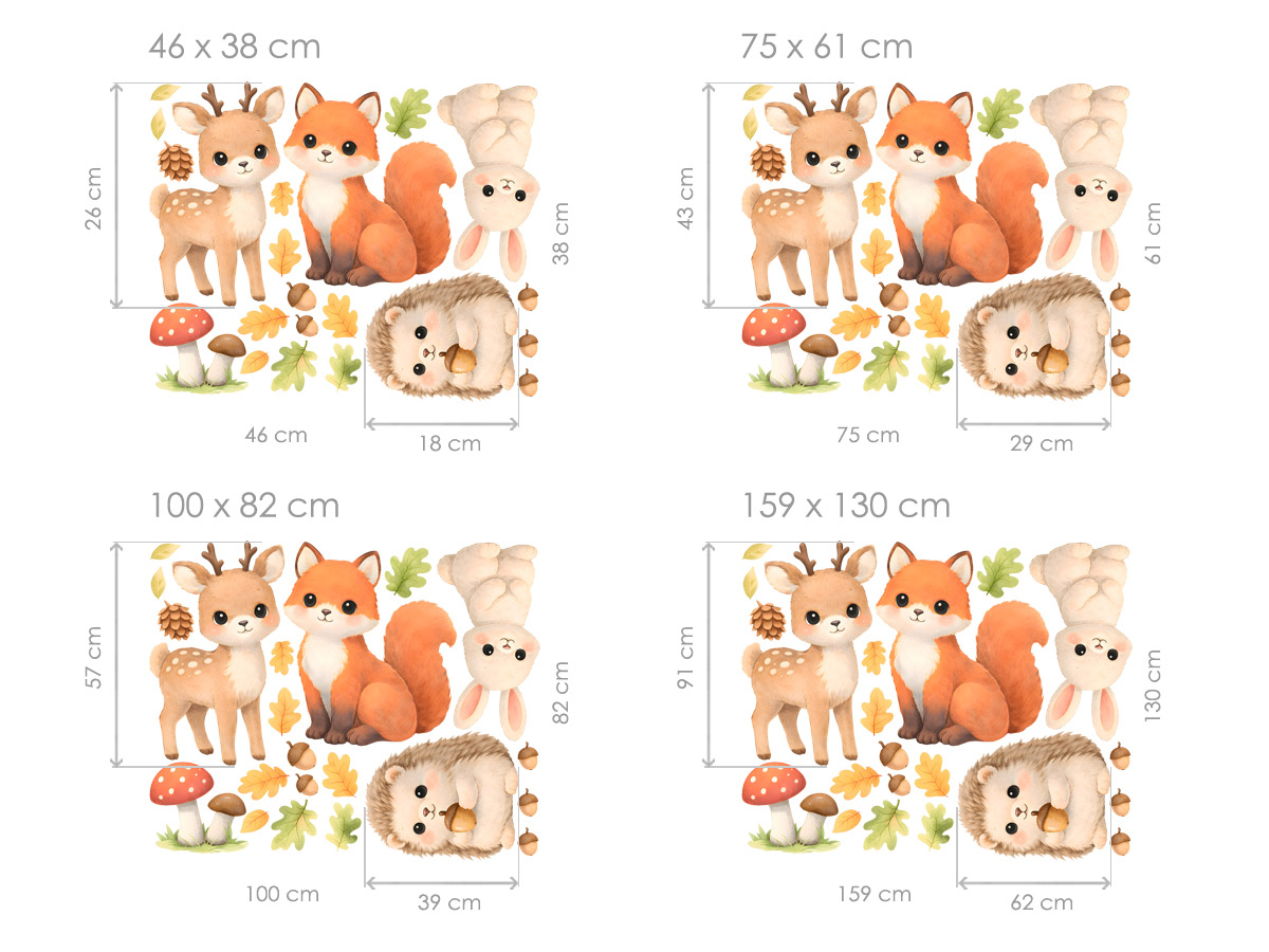 Něžné samolepky na zeď s kouzelnými lesními zvířátky přináší do dětského pokoje klidnou a hřejivou atmosféru inspirovanou přírodou. Roztomilý jelínek, lištička, králíček a ježeček doplnění podzimními lístky, žaludy a houbami vytvářejí harmonickou scénu, která podporuje fantazii i pocit bezpečí. Jemné akvarelové barvy působí uklidňujícím dojmem a snadno se sladí s různými styly dětského interiéru, takže samolepka je krásným doplňkem nad postel, komodu i hrací koutek. Díky více velikostem lze zvolit variantu přesně podle prostoru a vytvořit tak pohádkový les přímo na zdi dětského pokoje.