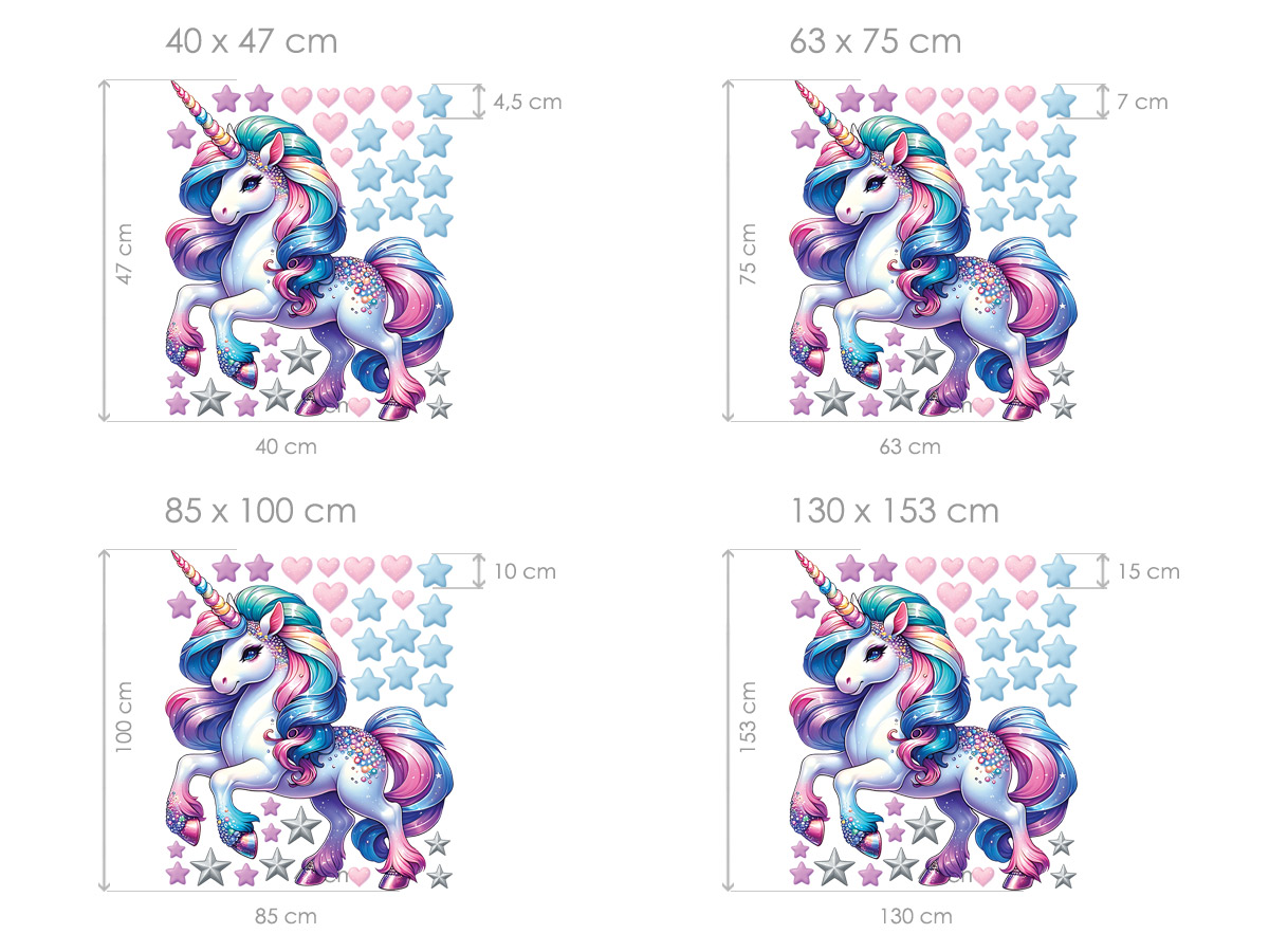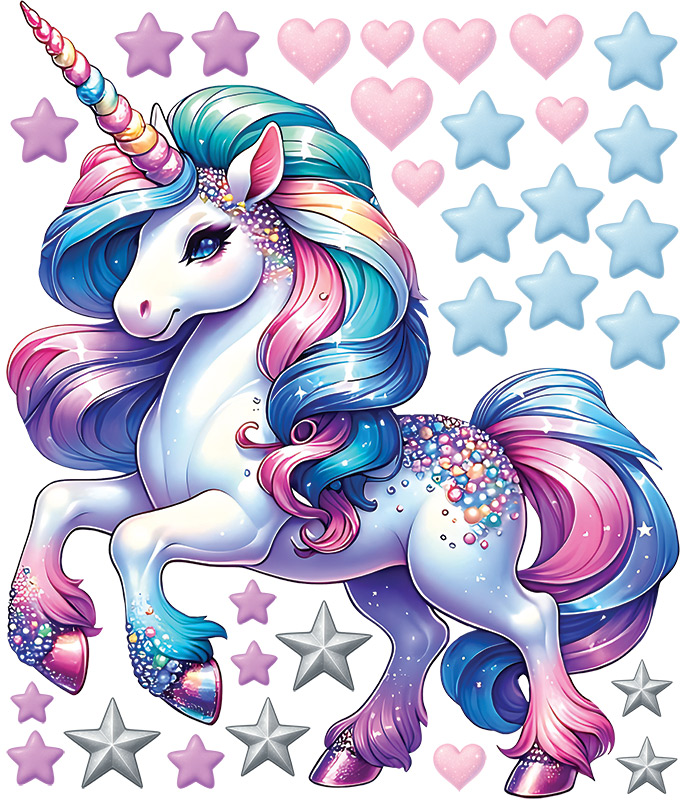 Samolepka na zeď „Kouzelný jednorožec“ promění dětský pokoj v pohádkové místo plné fantazie a barev. Jemné pastelové odstíny růžové, modré a fialové společně s třpytivými detaily vytvářejí kouzelnou atmosféru, která potěší každou malou milovnici pohádek a kouzelných tvorů. Hlavní motiv elegantního jednorožce doplňují hvězdičky a srdíčka různých velikostí, díky nimž lze stěnu vyzdobit přesně podle vlastní fantazie. Samolepka je vytištěna na kvalitním materiálem s matným povrchem, který eliminuje odlesky a působí přirozeně na jakékoliv barvě zdi. Dodává se ve formě archu, z něhož lze jednotlivé motivy snadno odlepit a aplikovat. Originální dekorace, která rozzáří každý dětský pokoj.