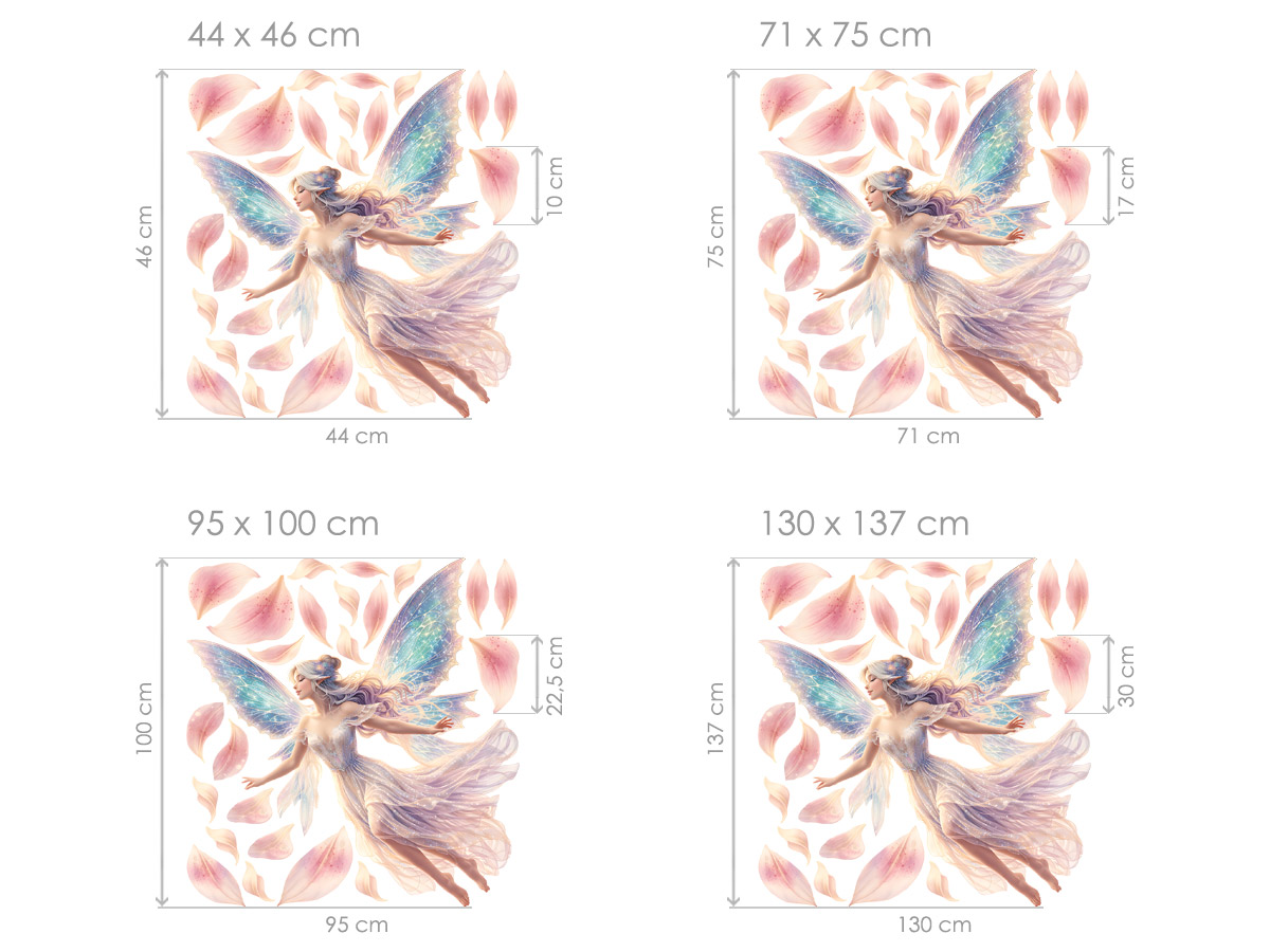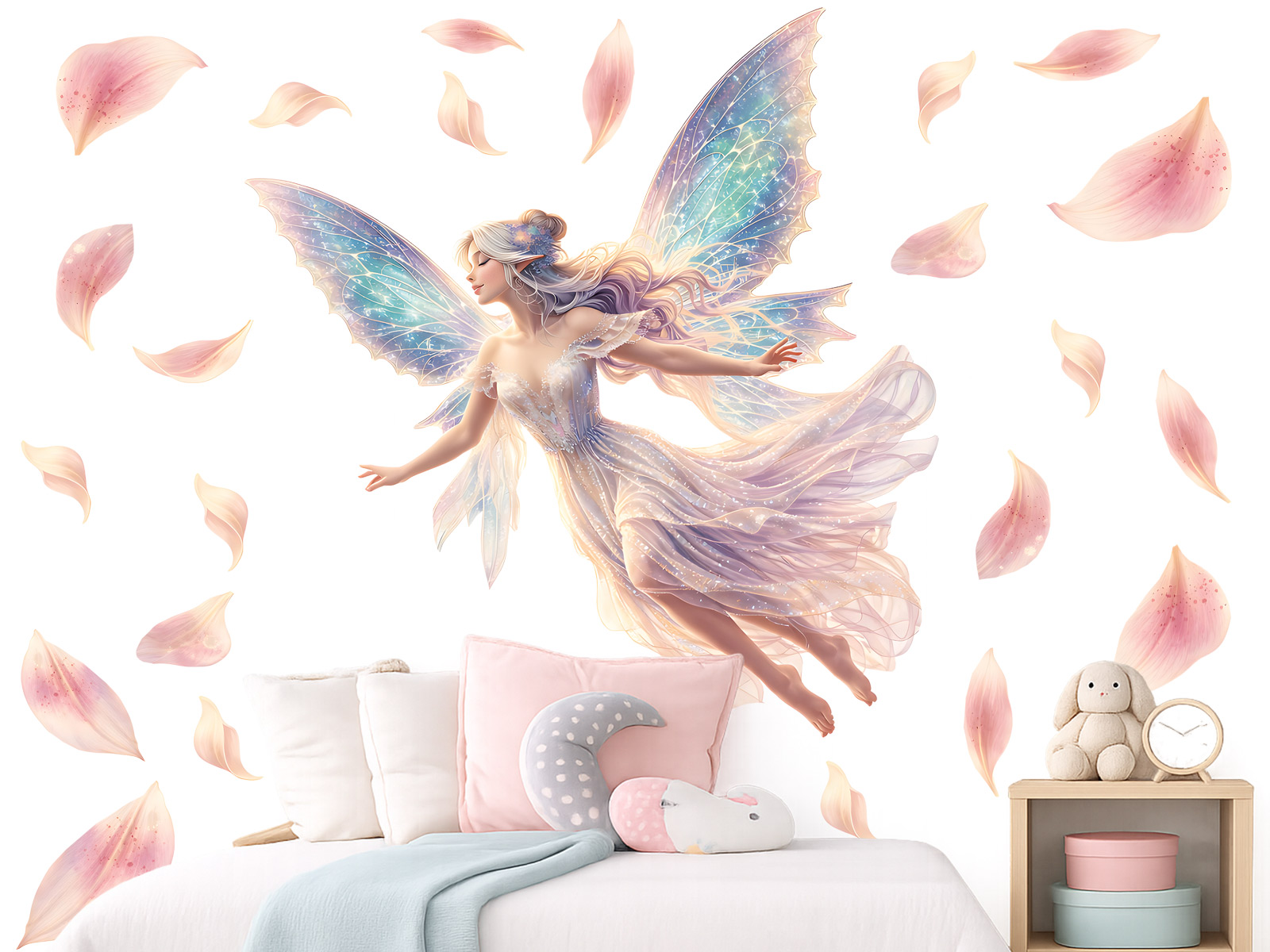 Samolepka na zeď Květinová víla je elegantní a snová dekorace, která promění dětský pokoj v kouzelné místo plné fantazie. Jemná víla s průsvitnými křídly a lehkými šaty působí vzdušně a ladně, jako by se právě vznášela mezi okvětními lístky. Celý motiv je laděný do pastelových odstínů růžové, meruňkové a jemně duhových tónů, které dodávají dekoraci něžný a harmonický vzhled. Poletující květinové lístky vytvářejí pocit pohybu a lehkosti, díky čemuž působí celá kompozice živě a zároveň uklidňujícím dojmem. Jednotlivé prvky lze snadno rozmístit podle vlastního prostoru a vytvořit si tak originální aranžmá – nad postel, kolem postýlky nebo jako dominantní prvek celé stěny. Ideální dekorace pro malé snílky a milovníky víl, kouzel a něžných pohádkových motivů.