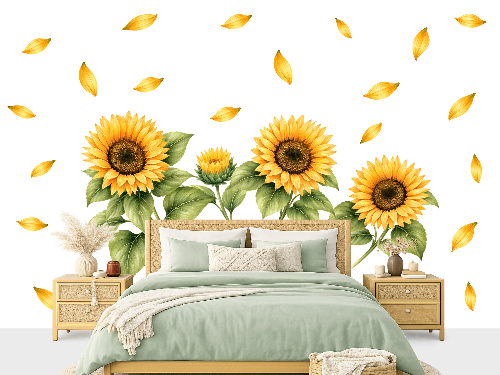 Samolepka na zeď Květiny slunečnice vnese do interiéru radost, teplo a energii letních dní. Výrazné žluté květy slunečnic působí optimisticky a rozjasní každý prostor, ve kterém se objeví. Akvarelové zpracování dodává květinám jemnost a přirozený vzhled, zatímco detailně vykreslené středy a listy podtrhují jejich realistický charakter. Poletující okvětní lístky vytvářejí lehký a dynamický efekt, který dekoraci oživuje. Díky samostatným prvkům si můžete jednotlivé květy uspořádat podle vlastních představ a přizpůsobit je konkrétní stěně. Skvěle se hodí do ložnice, obývacího pokoje, kuchyně i dalších místností, kde chcete vytvořit příjemnou a slunnou atmosféru. Ideální volba pro milovníky přírody a veselých barev, kteří chtějí svému domovu dodat pozitivní energii a svěžest.