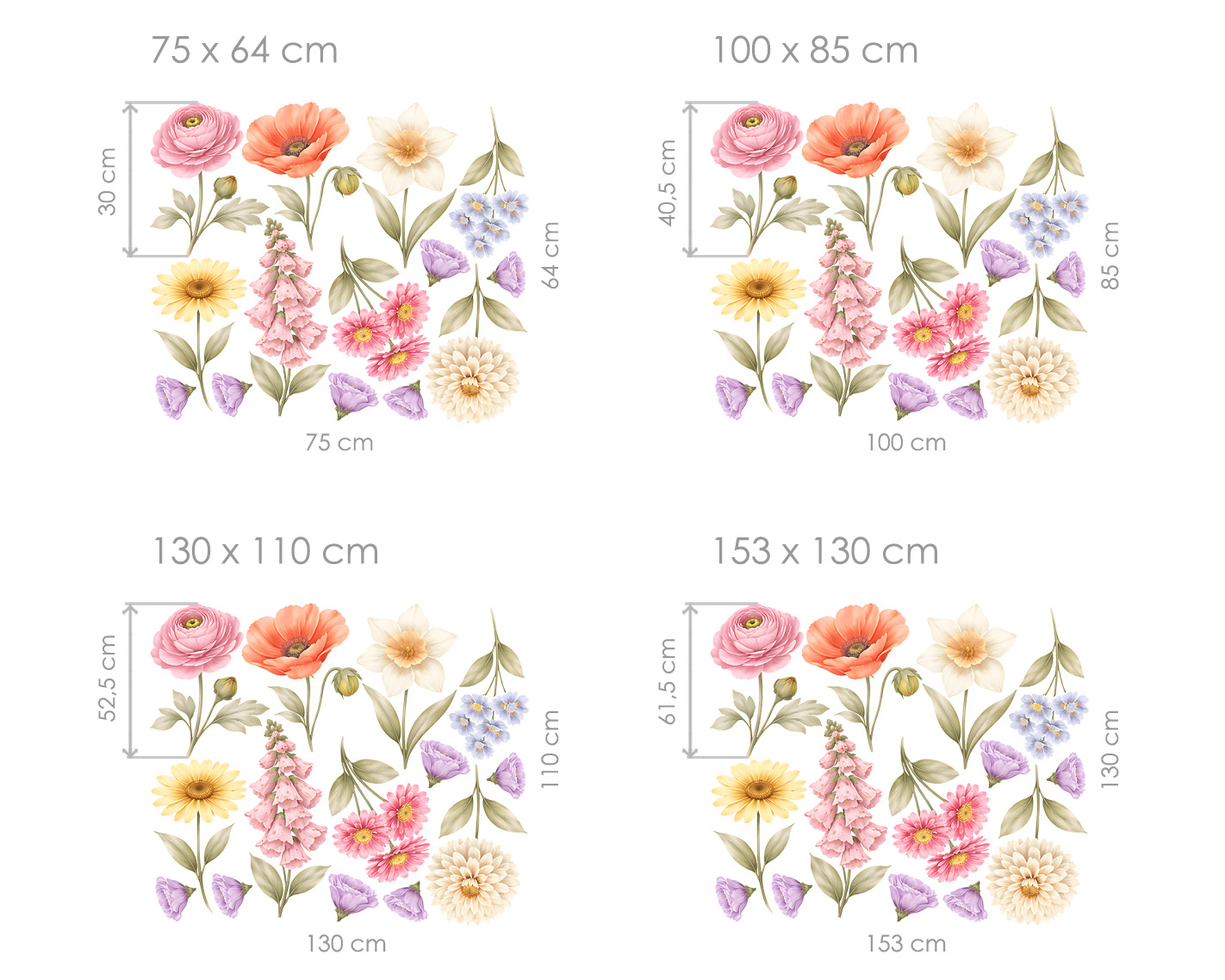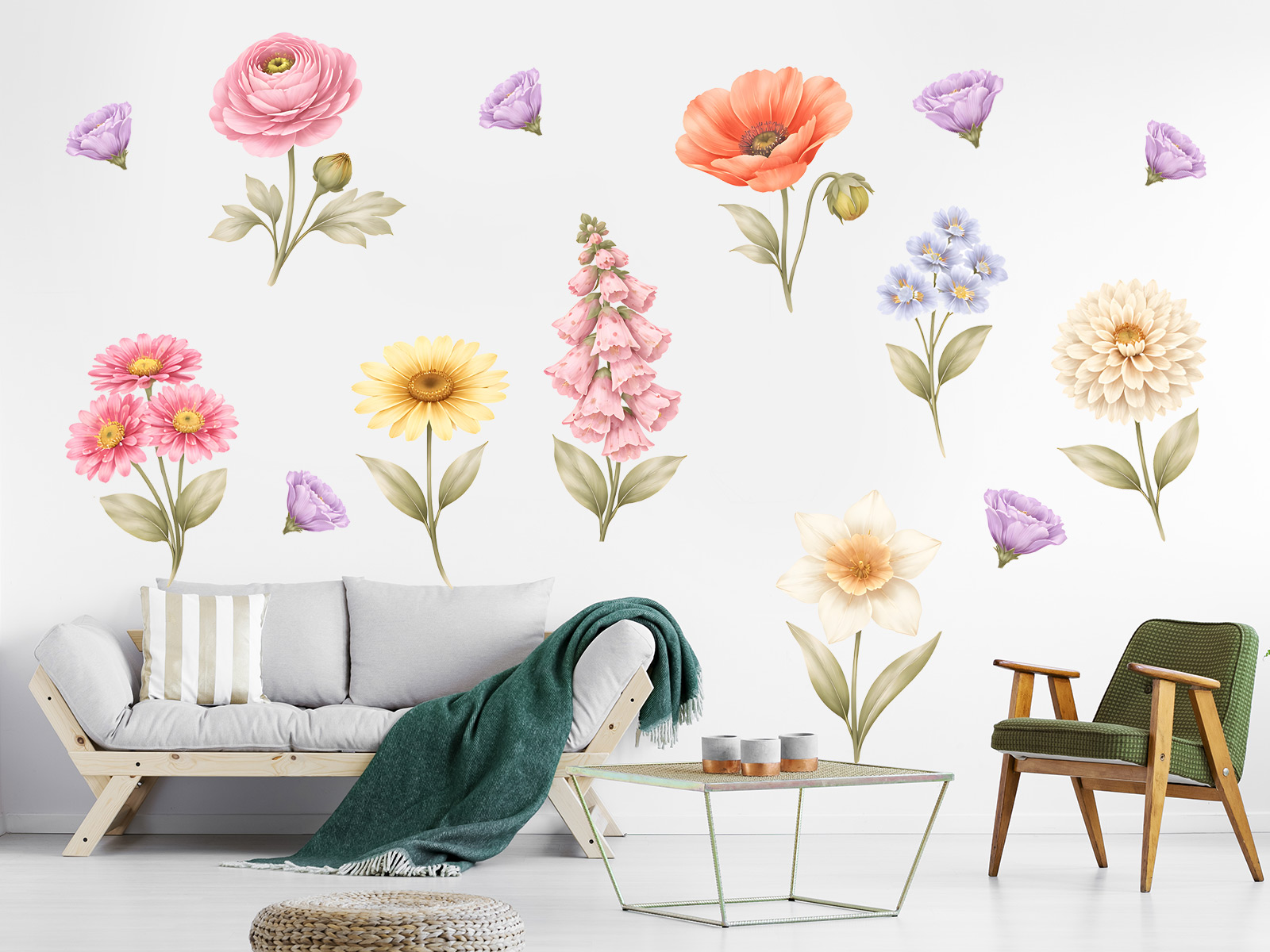 Samolepky na zeď Kytičky květinky přináší do interiéru jemný a elegantní květinový motiv, který působí svěže a harmonicky. Různorodé květy v pastelových barvách vytvářejí krásnou kompozici, která oživí každou stěnu. Akvarelové zpracování dodává ilustracím lehkost, měkké přechody a přirozený vzhled. Každý květ je detailně propracovaný, přesto celek působí vzdušně a nenápadně. Motiv je ideální do obývacího pokoje, ložnice i dětského pokoje, kde vytvoří příjemnou a uklidňující atmosféru. Díky variabilnímu rozmístění jednotlivých květin si můžete dekoraci přizpůsobit přesně podle svého prostoru. Perfektní volba pro všechny, kteří milují květiny, jemné barvy a přírodní styl.