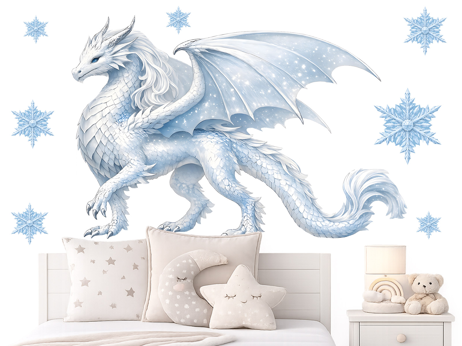 Samolepka na zeď Ledový drak Frozen přináší do dětského pokoje kouzelnou zimní atmosféru plnou jemných detailů a pohádkové elegance. Dominantní motiv ledového draka v chladných modrých tónech doplňují něžné sněhové vločky, které vytvářejí klidný a harmonický celek vhodný pro malé milovníky fantazie i dobrodružství. Díky kvalitnímu tisku vyniknou jemné přechody barev i struktura šupin, takže dekorace působí velmi přirozeně a zároveň výrazně oživí prázdnou stěnu nad postelí nebo herním koutkem. Samolepka se snadno aplikuje, dobře drží na hladkém povrchu a je dostupná v několika velikostech, aby se přizpůsobila různě velkým prostorům. Je ideální volbou pro vytvoření útulného, pohádkového prostředí, ve kterém se děti budou cítit bezpečně a budou si moci každý den představovat vlastní příběhy z ledového království.