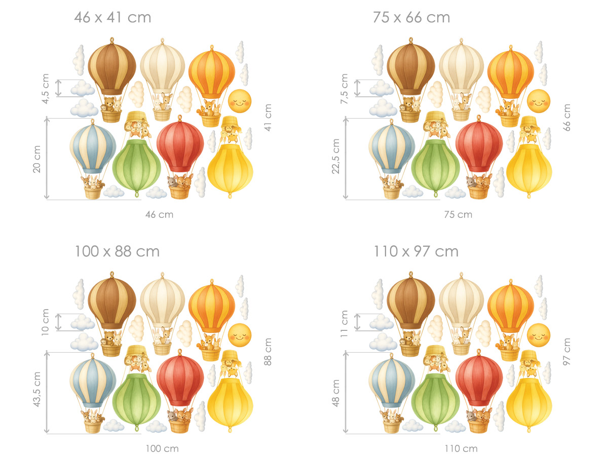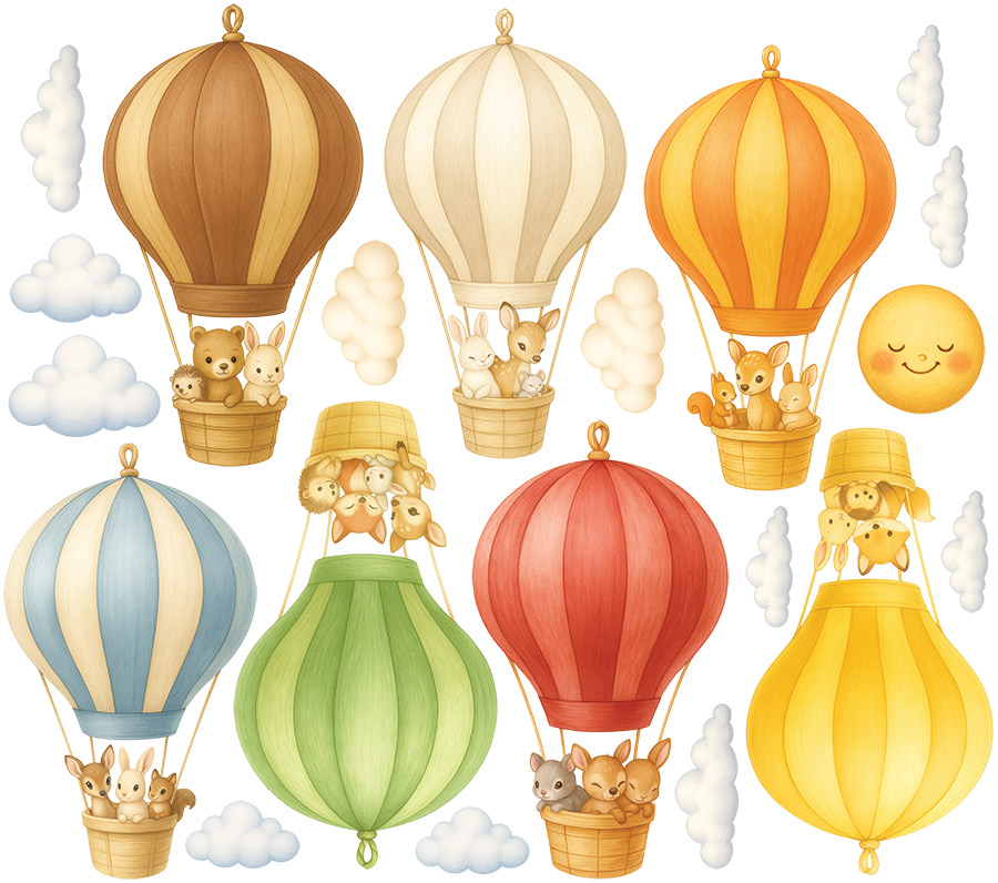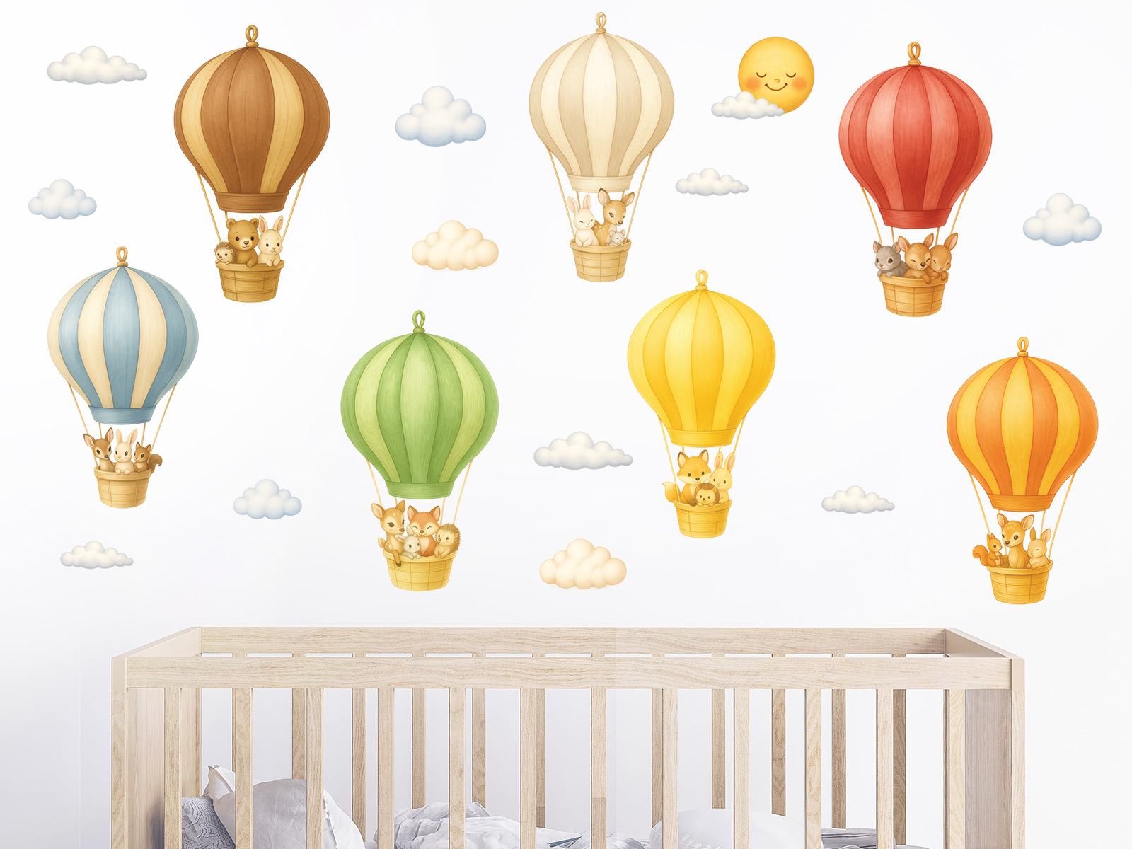 Samolepka na zeď „Lesní zvířátka v balónech“ vnese do dětského pokojíčku jemnost, radost a pohádkovou atmosféru. Roztomilí medvídci, zajíčci, lištičky či veverky se vznášejí v barevných horkovzdušných balónech mezi obláčky a sluníčkem – motiv, který potěší malé snílky i milovníky dobrodružství. Ilustrace jsou vytvořené v měkkých pastelových barvách a působí hřejivě a klidně, takže skvěle doplní interiér dětského pokoje bez ohledu na jeho styl. Set obsahuje celý arch s balónky, zvířátky, obláčky a sluníčkem – vše připravené k vytvoření kouzelné scény na zdi.