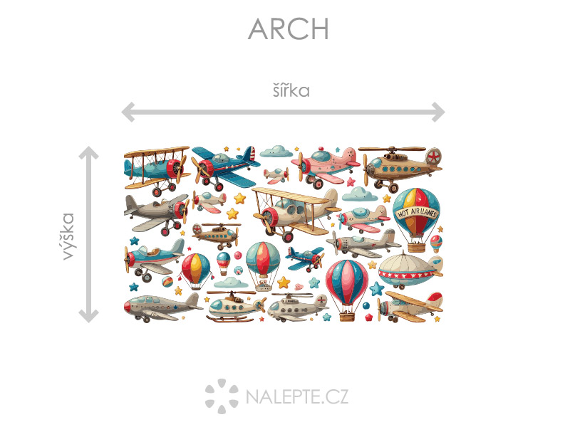 Arch = takto vám bude samolepka doručena. Každý prvek na archu je samostatná samolepka, jednotlivé části jednoduše od papírového podkladu odlepíte a nalepíte na zeď tak, aby složily výsledný motiv dle Vašich představ. Arch si můžete prohlédnout ve fotogalerii. Rozměr archu volíte v objednávce. Přehled předdefinovaných rozměrů (šířka x výška): a) arch 46 x 26 cm b) arch 75 x 42 cm c) arch 100 x 56 cm d) arch 130 x 73 cm Je možné zvolit i libovolný vlastní rozměr archu pomocí posuvníku či klikání na "Větší", "Menší"