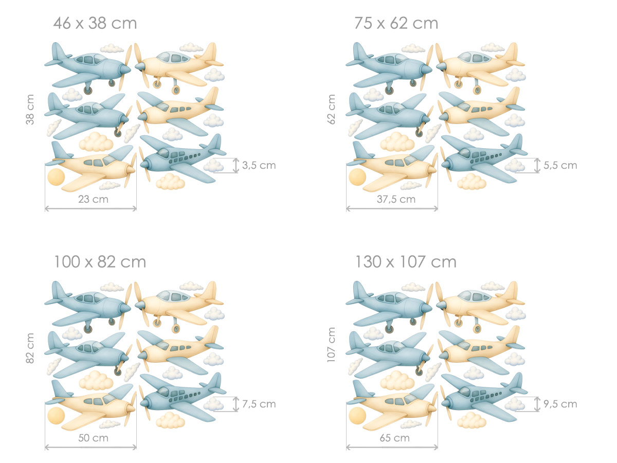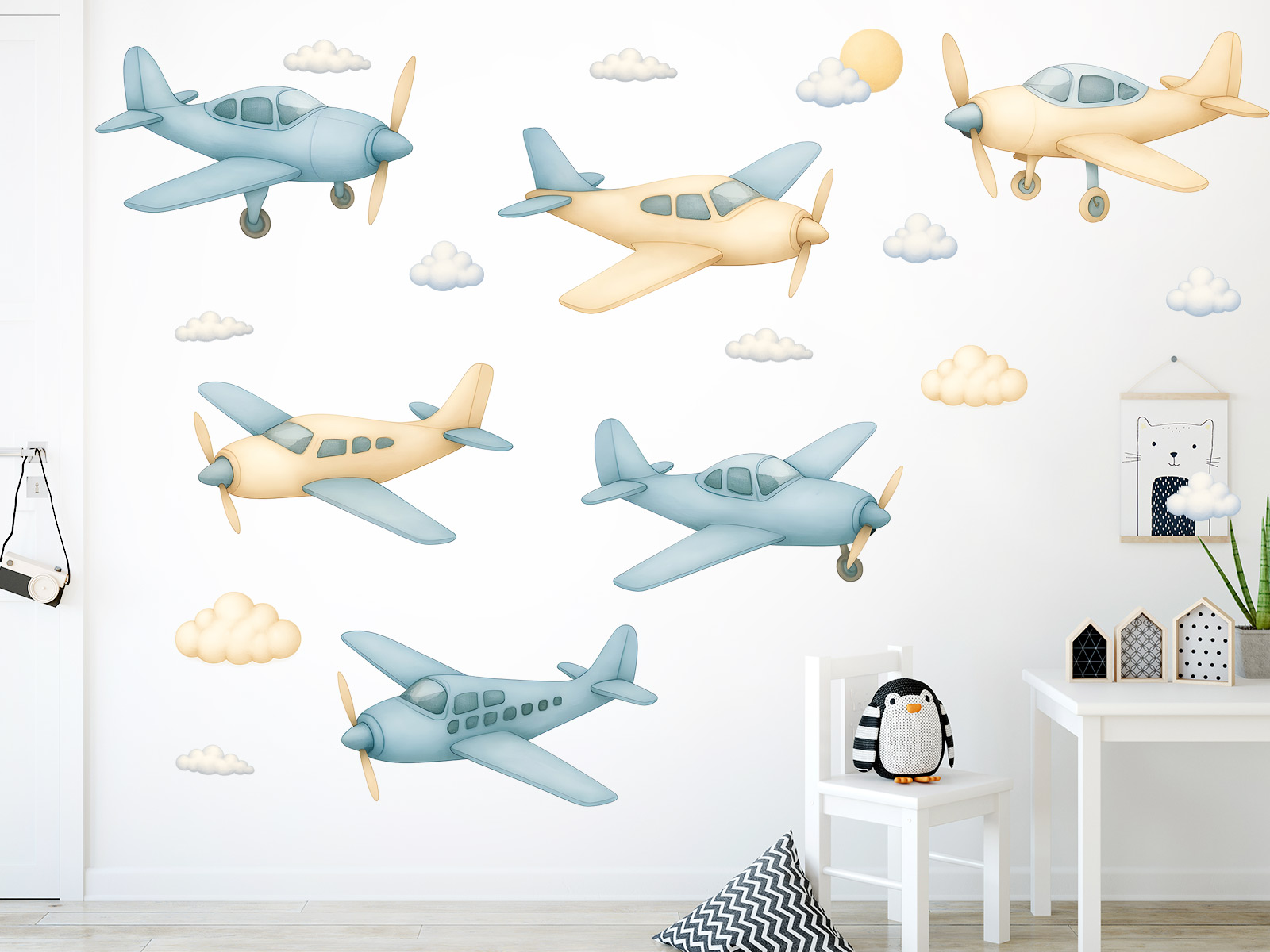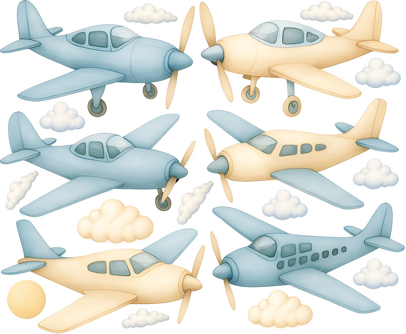 Samolepka na zeď „Letadýlka“ přináší do dětského pokoje výjimečné kouzlo dobrodružství a lehkosti. Jemně malovaná letadla v pastelových modrých a béžových tónech působí uklidňujícím dojmem a ladně doplňují moderní i klasický interiér. Součástí archu jsou také obláčky a sluníčko, díky kterým můžete vytvořit vlastní jedinečnou oblohu přímo nad postýlkou. Tato samolepka je ideální pro malé piloty i milovníky cestování – snadno se aplikuje a během okamžiku promění pokoj v hravý prostor plný fantazie a pohody.
