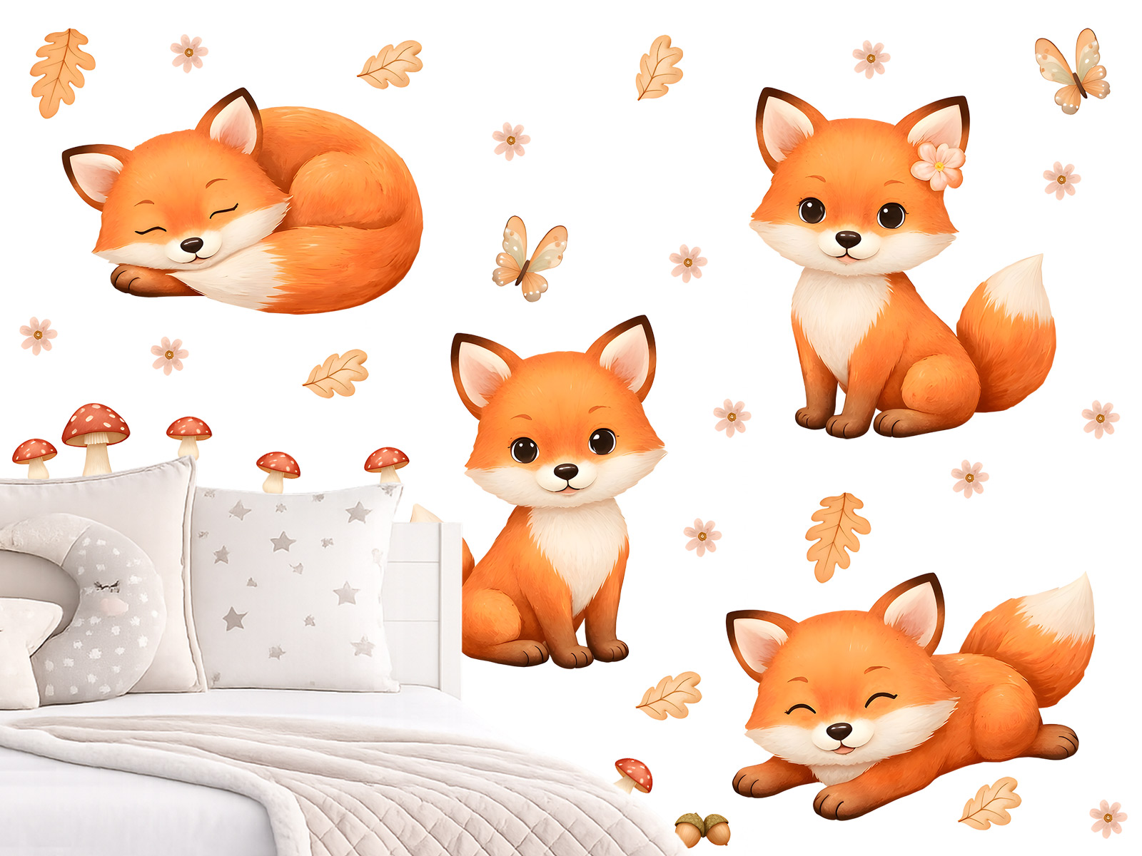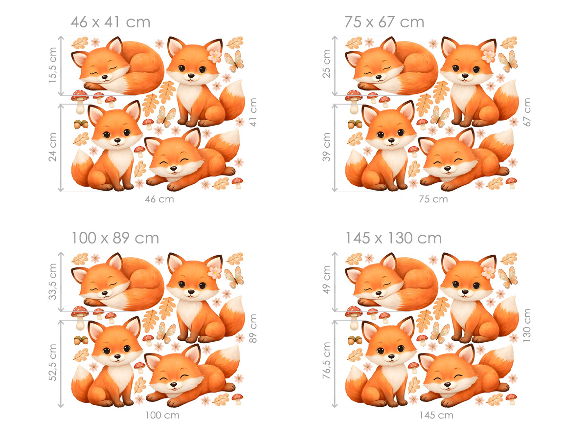 Samolepky na zeď Lišky z lesa jsou hravou a něžnou dekorací, která vnese do dětského pokojíčku teplo a pohodu přírody. Roztomilé lištičky v různých pozicích – spinkající, sedící i hravé – působí velmi přátelsky a přirozeně. Celý motiv doplňují jemné detaily jako lístečky, houbičky, kvítky a motýlci, které vytvářejí lehkou lesní atmosféru. Teplé oranžové odstíny lišek krásně kontrastují s jemným pozadím a dodávají prostoru útulnost. Díky samostatným prvkům si můžete jednotlivé lištičky rozmístit podle vlastního prostoru a vytvořit tak originální kompozici na míru. Ideální nad postel, do hracího koutku nebo na větší stěnu, kde vynikne celý lesní příběh.