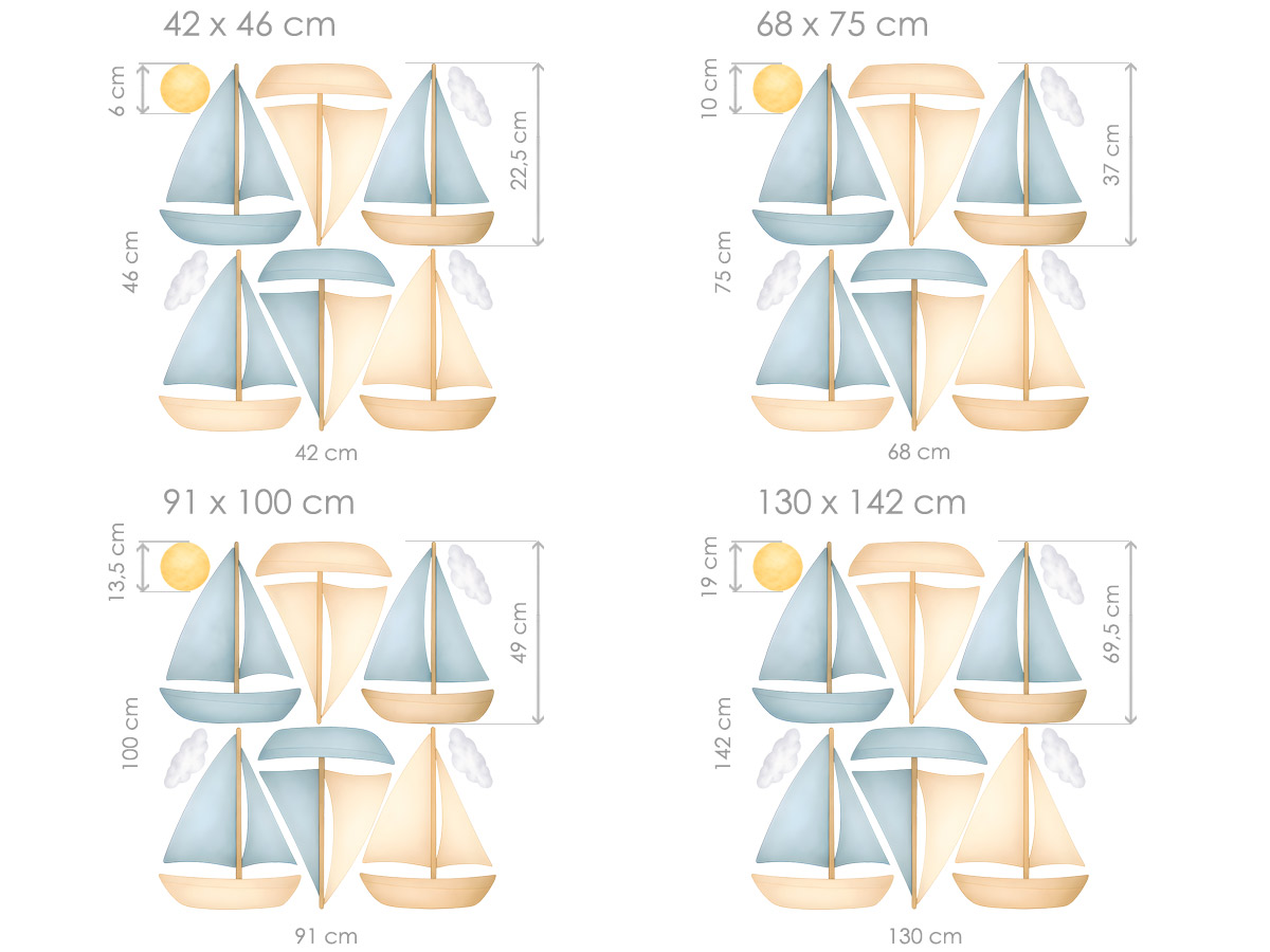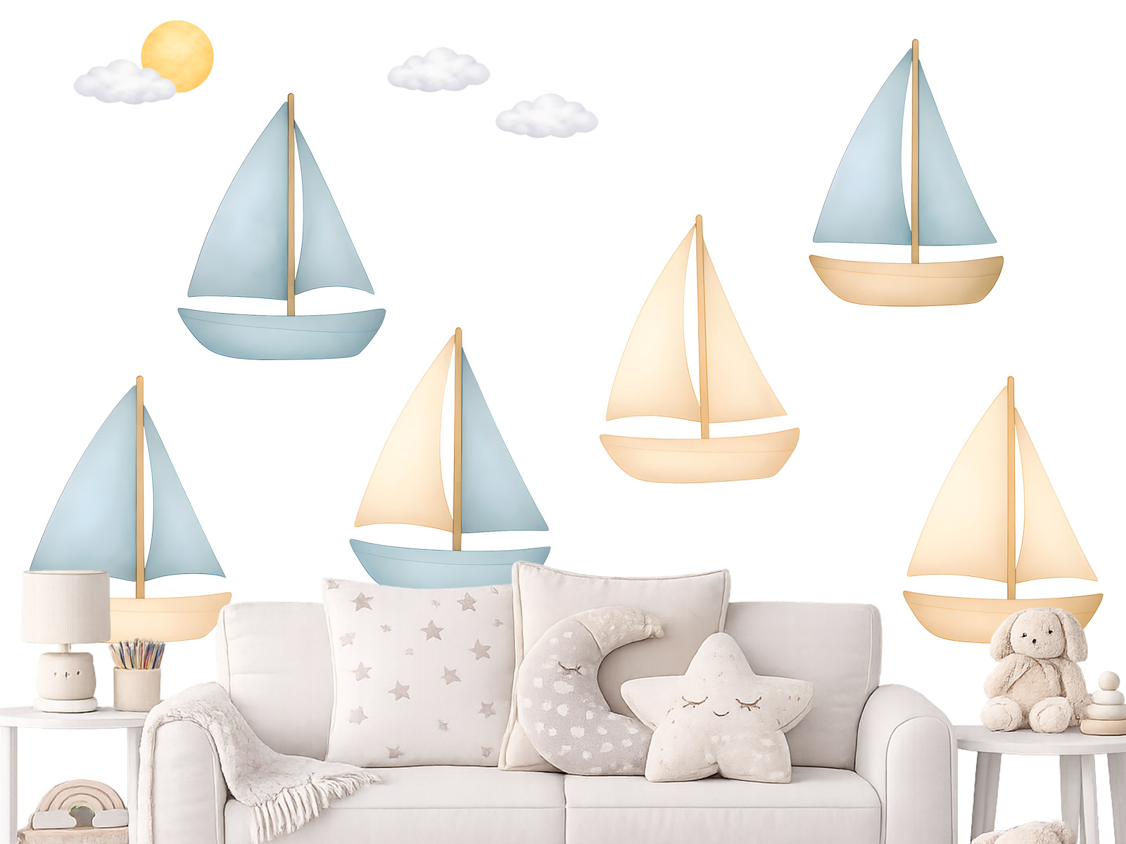 Samolepky na zeď Loďky plachetnice přinášejí do dětského pokoje klidnou a jemnou námořnickou atmosféru. Elegantní plachetnice v pastelových odstínech modré a béžové působí velmi harmonicky a dodávají prostoru lehkost a vzdušnost. Motiv doplňují drobné detaily, jako jsou obláčky a slunce, které podtrhují poklidnou atmosféru plavby po moři. Celkový design je čistý a jemný, takže se snadno kombinuje s ostatním vybavením pokoje. Tato dekorace je ideální do dětského pokoje, zejména pro miminka nebo kluky, ale díky neutrálním barvám se hodí i do moderně laděných interiérů. Plachetnice můžete rozmístit po celé stěně nebo vytvořit jednoduchou scénu nad postelí, čímž vznikne příjemné a uklidňující prostředí inspirované mořem.