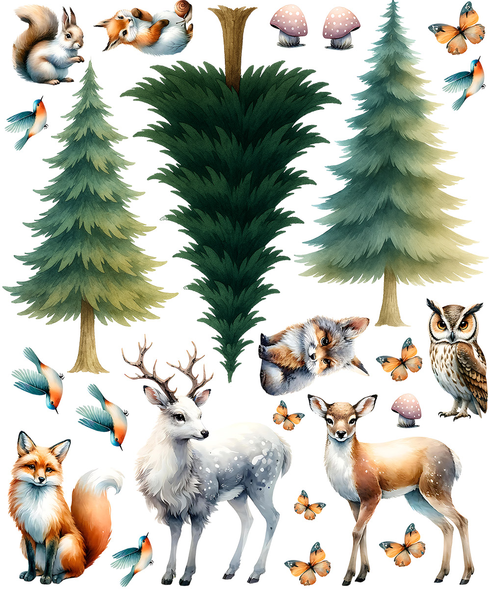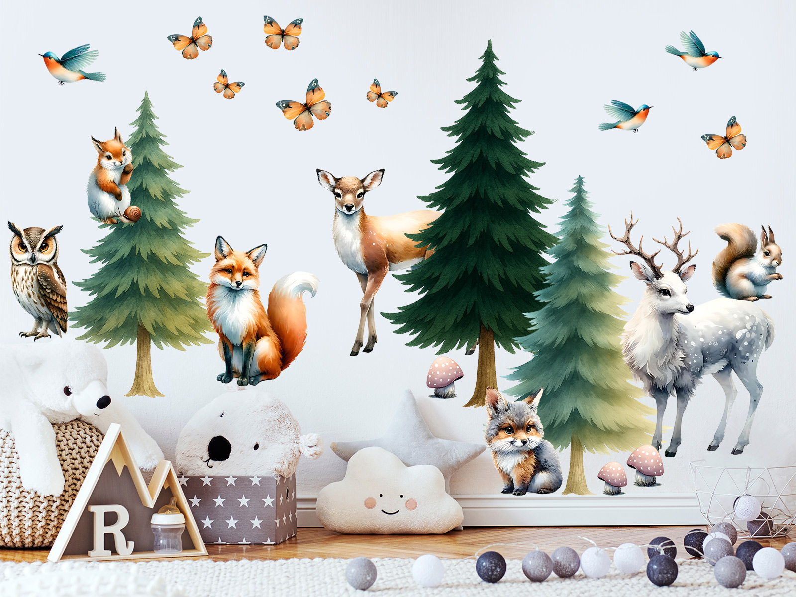 Objevte kouzlo lesa přímo v dětském pokoji s nádhernou sadou samolepek „Malovaná lesní zvířátka“. Jemně akvarelové ilustrace přinášejí do interiéru klidnou atmosféru přírody a vytvářejí útulné a hřejivé prostředí pro malé objevitele i snílky. V sadě najdete lišky, jelena, srnku, sovu, veverky, ptáčky, motýlky a muchomůrky, doplněné o malované jehličnaté stromy. Každý motiv je samostatná samolepka, takže si můžete vytvořit vlastní lesní scénu podle fantazie – kolem postýlky, stolečku nebo v hracím koutku.