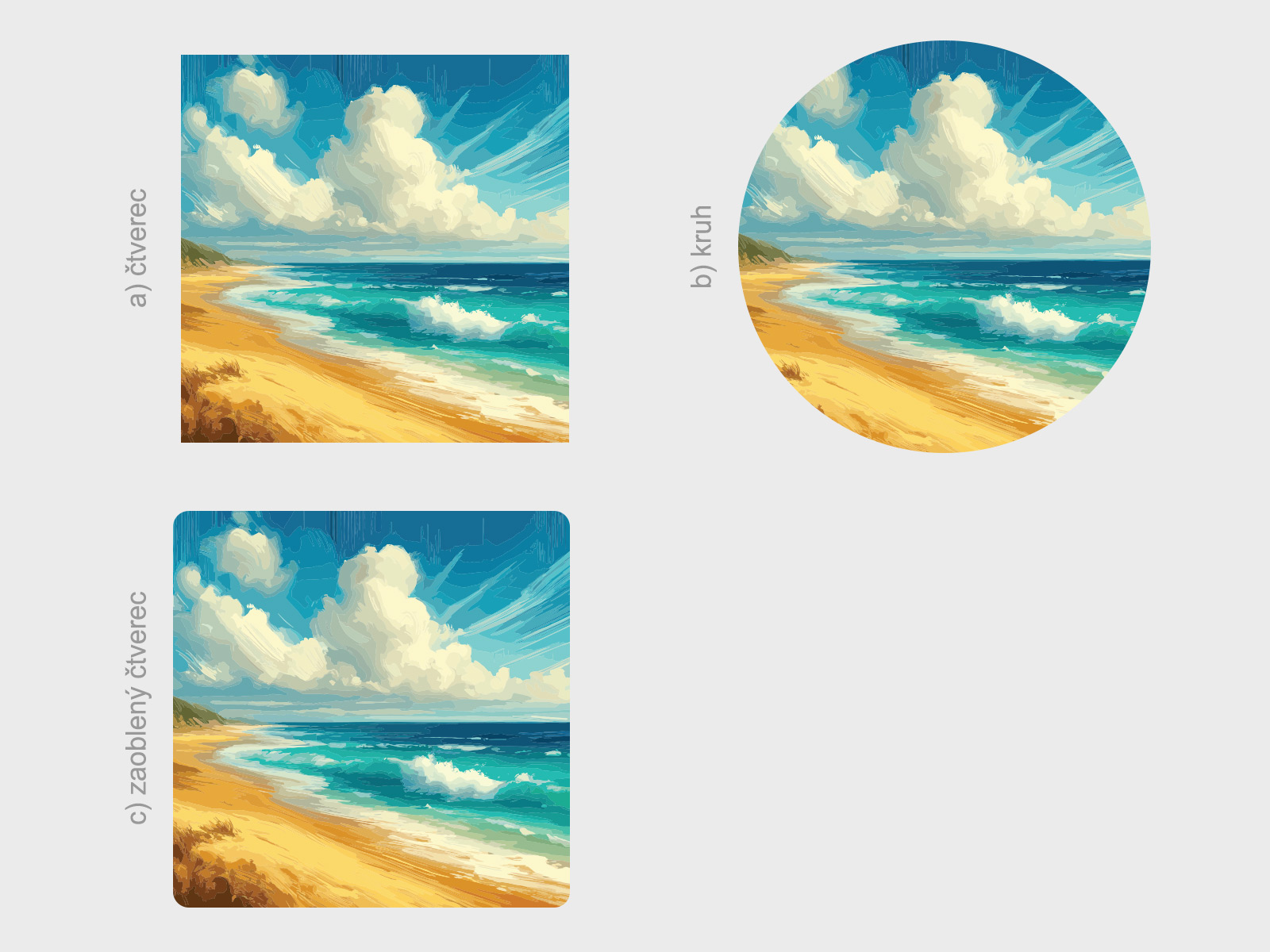 Tvar je možné změnit. Lze vybrat a) čtverec, b) kruh, c) zaoblený čtverec viz fotogalerie. Pokud tedy máte zájem o jiný tvar než na hlavní fotografii, stačí v posledním kroku objednávky do pole poznámka napsat např. "čtverec". Jedná se o tištěný samolepící plakát - imitace malby Je možné zvolit i libovolný vlastní rozměr archu pomocí posuvníku či klikání na "Větší", "Menší"