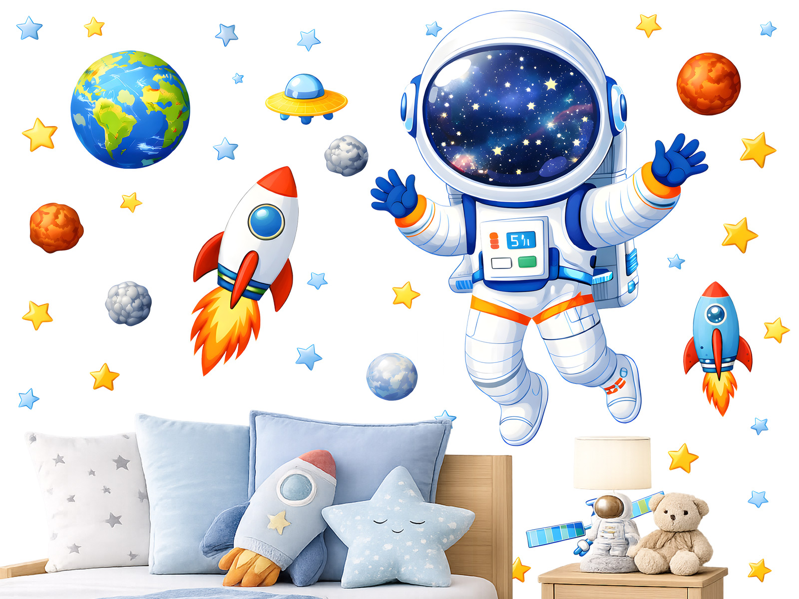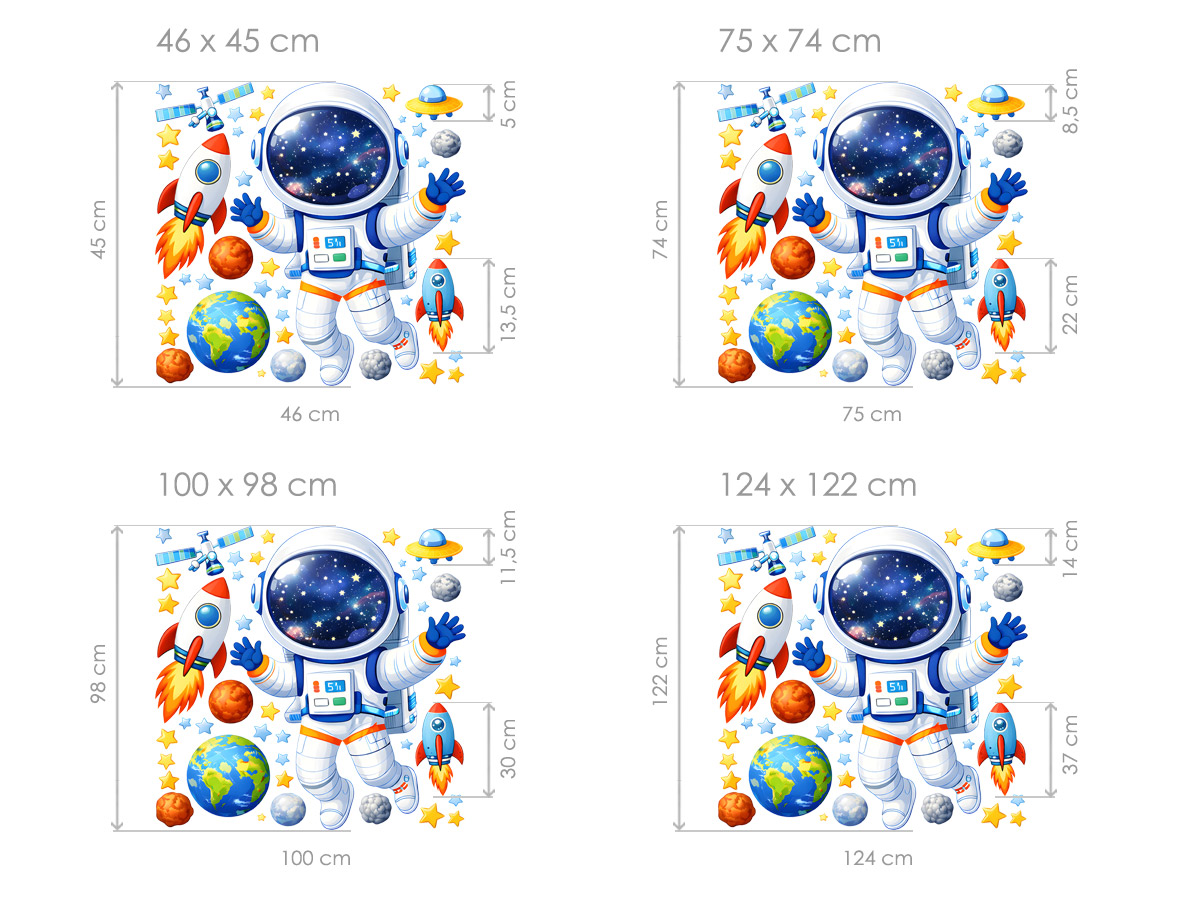 Samolepka na zeď „Malý kosmonaut“ zve děti na dobrodružnou výpravu do vesmíru plnou hvězd, planet a raket. Hlavním motivem je roztomilý kosmonaut vznášející se v otevřeném vesmíru, doplněný o pestré ilustrace Země, planetek, raket, satelitu a hvězdiček, které společně vytvářejí hravou a fantazijní scénu. Díky samostatným prvkům si děti mohou motivy rozmístit podle vlastní představy a vytvořit si na zdi svůj vlastní vesmírný svět. Jemné barvy, přátelský výraz kosmonauta a detailní ilustrativní styl podporují dětskou představivost, zájem o vesmír a chuť objevovat neznámé galaxie. Tato samolepka je ideální volbou pro malé objevitele, kteří sní o cestách ke hvězdám, a stane se výraznou a hravou dominantou každého dětského pokoje.