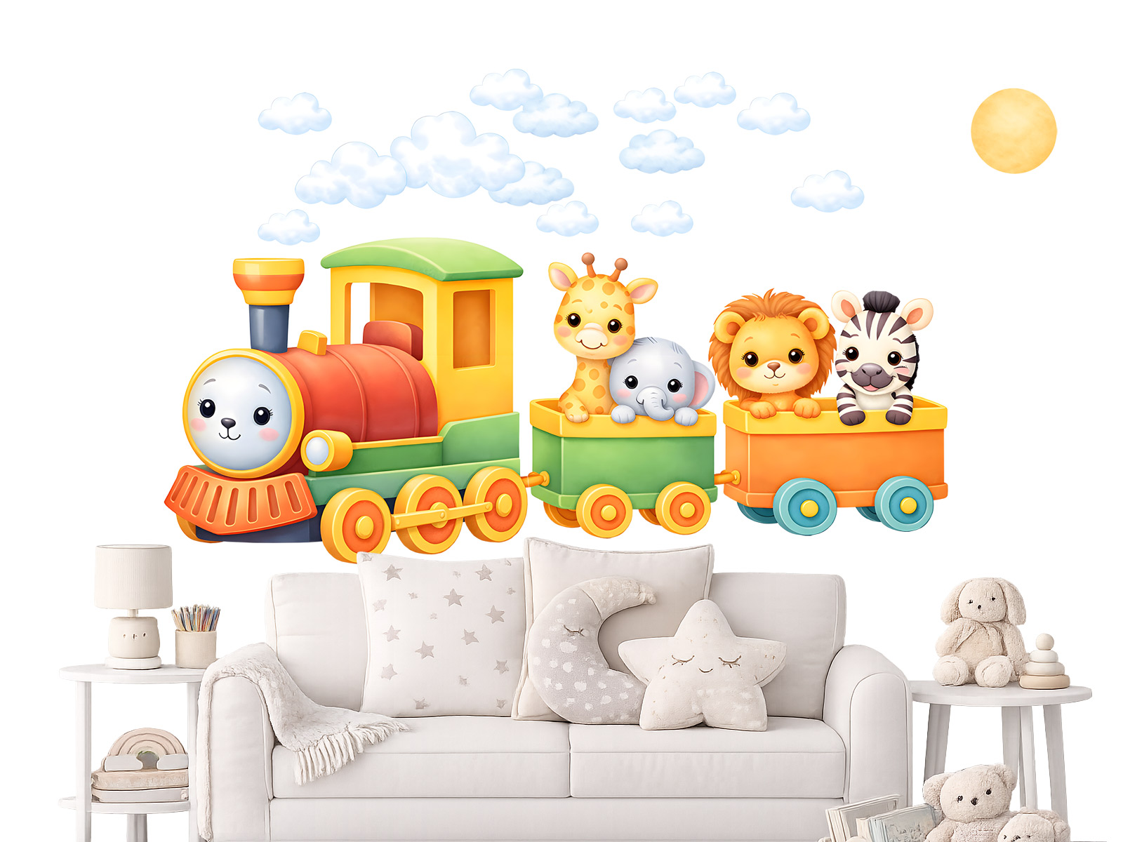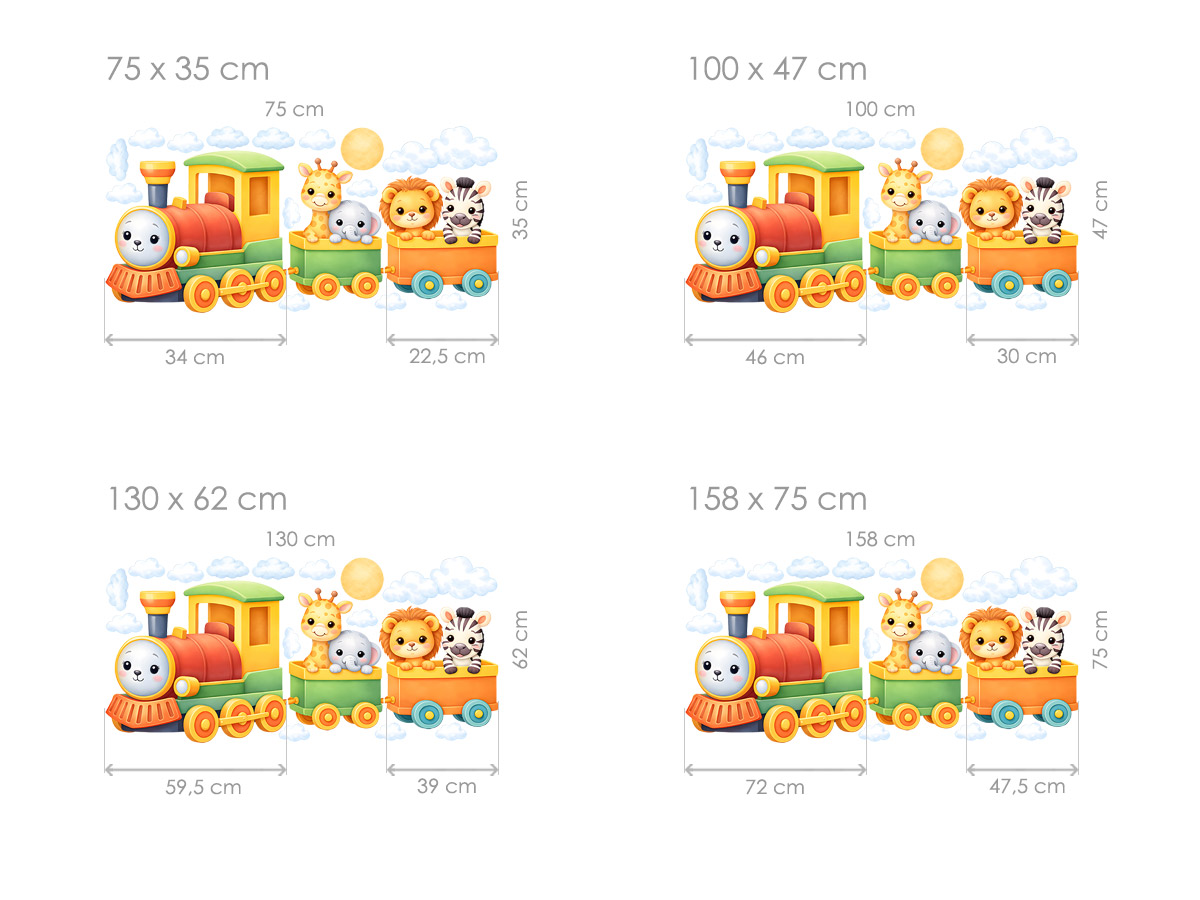 Samolepka na zeď Vláček se zvířátky přináší do dětského pokoje hravou a veselou scénu plnou roztomilých kamarádů. Barevná lokomotiva táhne vagónky se zvířátky, která působí mile a přátelsky, takže si je děti okamžitě oblíbí. Každé zvířátko má svůj vlastní výraz i charakter – žirafka, sloník, lev i zebra společně vytvářejí zábavnou kompozici, která podněcuje dětskou fantazii a chuť objevovat. Veselé barvy jako žlutá, oranžová a zelená dodávají celé dekoraci energii a krásně rozzáří každý pokojíček. Motiv je doplněn o mráčky a sluníčko, které navozují příjemnou denní atmosféru. Díky samostatným prvkům si můžete jednotlivé části rozmístit podle vlastního prostoru a vytvořit si tak originální uspořádání na míru. Ideální dekorace do pokojíčku malých dětí, které milují zvířátka, vláčky a hravé dobrodružství.