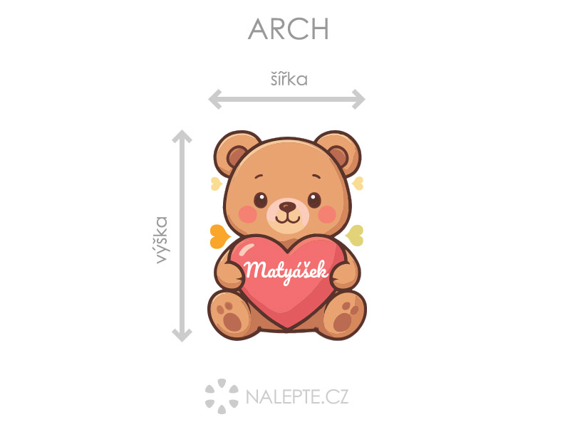 Jméno na přání v srdíčku lze samotné nebo kombinovat s datem narození nebo například věkem (tento údaj bude vycentrován pod jménem ve druhém řádku). Text zadejte ve 3. kroku objednávky do pole "poznámka". Máte-li speciální přání kontaktujte nás: info@nalepte.cz. Bude Vám zaslán náhled ke schválení emailem. Arch = takto vám budou samolepky doručeny. Každý prvek na archu je samostatná samolepka, jednotlivé části jednoduše od papírového podkladu odlepíte a nalepíte na zeď tak, aby složily výsledný motiv dle Vašich představ. Arch si můžete prohlédnout ve fotogalerii. Rozměr archu volíte v objednávce. Přehled předdefinovaných rozměrů (šířka x výška): a) arch 35 x 46 cm b) arch 58 x 76 cm c) arch 76 x 100 cm c) arch 99 x 130 cm Je možné zvolit i libovolný vlastní rozměr archu pomocí posuvníku či klikání na "Větší", "Menší" Šířka medvěda odpovídá šířce archu, výška medvídka odpovídá výšce archu