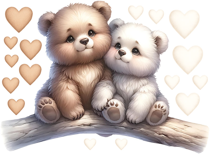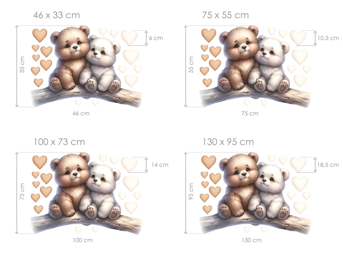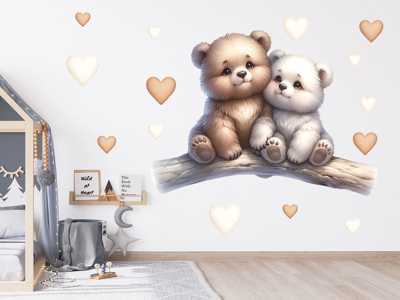 Roztomilá sada samolepek s dvěma medvídky sedícími na větvi vnese do dětského pokojíčku pocit klidu, něhy a přátelství. Ilustrace působí hřejivě a přirozeně díky jemným pastelovým barvám a měkkému světlu. Doplňující srdíčka v odstínech světlé a hnědé barvy dodávají dekoraci útulný a harmonický vzhled. Ideální pro výzdobu nad postýlku, koutek na hraní nebo do školky. Obsah sady: - 2 medvídci sedící na větvi - sada srdíček v béžových a světle hnědých tónech