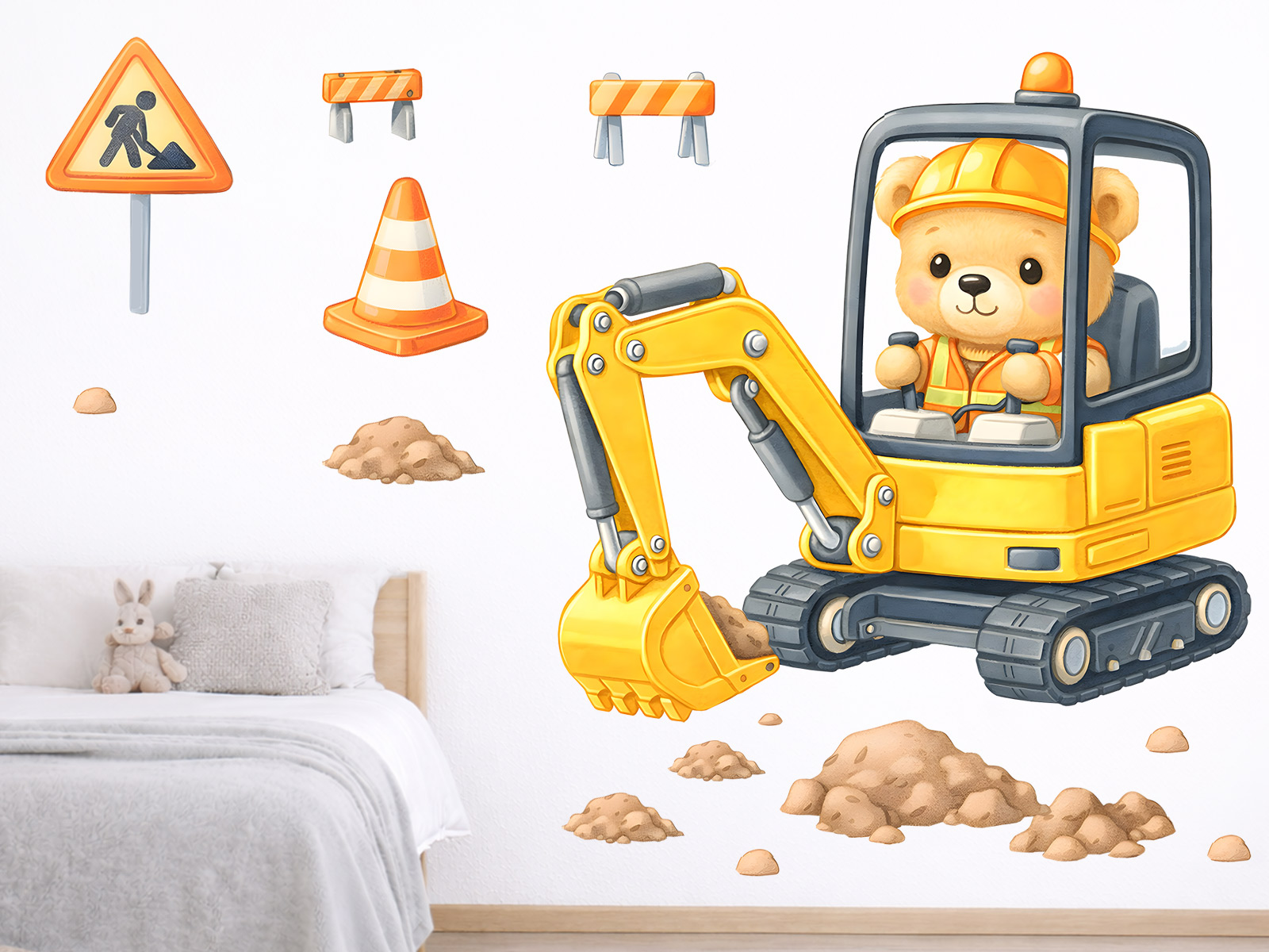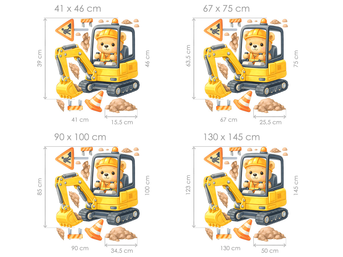 Roztomilá samolepka na zeď s medvídkem bagristou přináší do dětského pokoje hravou atmosféru plnou fantazie a dobrodružství. Jemná ilustrace v příjemných barvách krásně vynikne nad postelí, u pracovního koutku i na prázdné stěně, kde vytvoří milý prostor pro hru i odpočinek. Motiv malého stavitele potěší všechny děti, které mají rády auta, techniku a příběhy ze staveniště, a zároveň působí něžně a uklidňujícím dojmem, takže se snadno sladí s ostatním vybavením pokojíčku. Díky různým velikostem si můžete zvolit variantu, která nejlépe odpovídá prostoru a vytvořit tak harmonickou dekoraci, jež bude dětem dělat radost každý den.