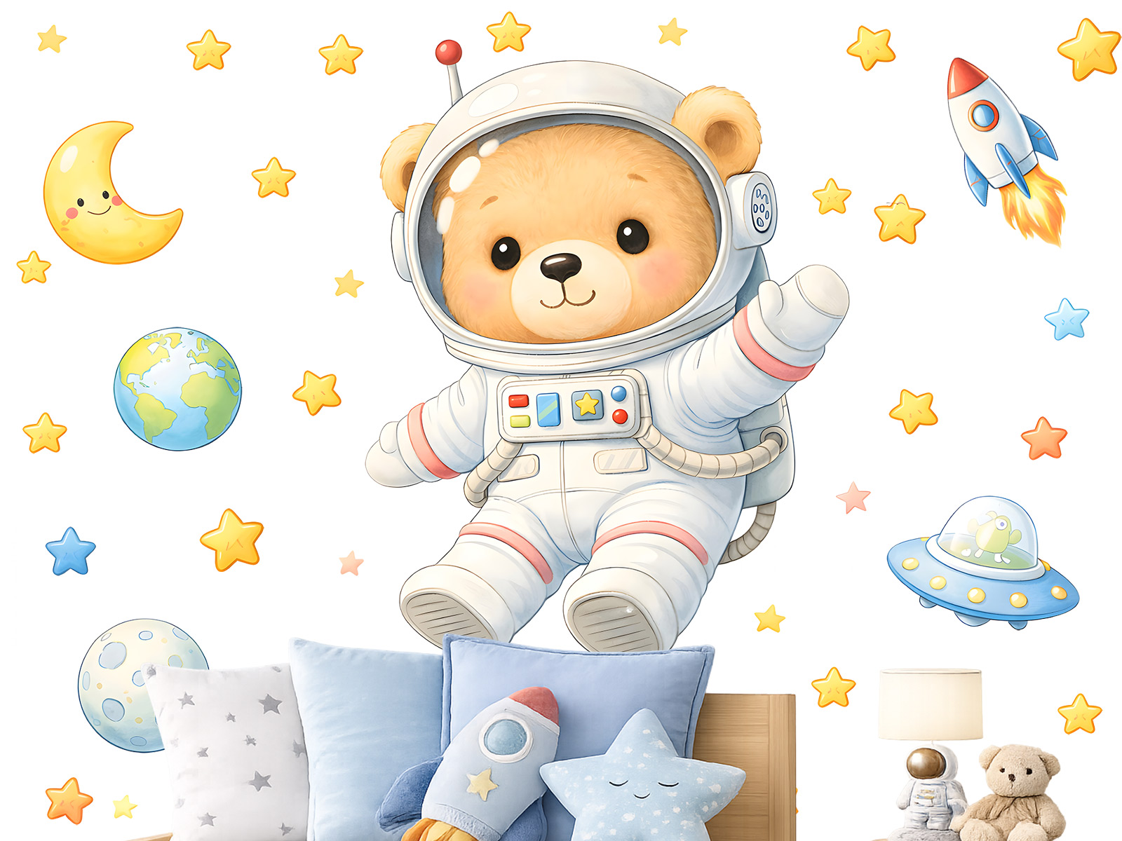 Samolepka na zeď Medvídek kosmonaut přenese dětský pokoj do kouzelného světa vesmíru, kde se sny o hvězdách a dobrodružstvích stávají skutečností. Roztomilý medvídek v astronautském obleku obklopený planetami, hvězdičkami, Měsícem a raketou podporuje dětskou fantazii, zvídavost a touhu objevovat. Jemné barvy a hravé ilustrace působí mile a uklidňujícím dojmem, díky čemuž se samolepka skvěle hodí do chlapeckého i dívčího pokoje. Motiv lze snadno kombinovat s dalšími vesmírnými dekoracemi a vytvořit tak útulný kout plný snění, her a příběhů o dalekých galaxiích. Medvídek kosmonaut se rychle stane oblíbeným kamarádem, který bude děti provázet při usínání i každodenním hraní.