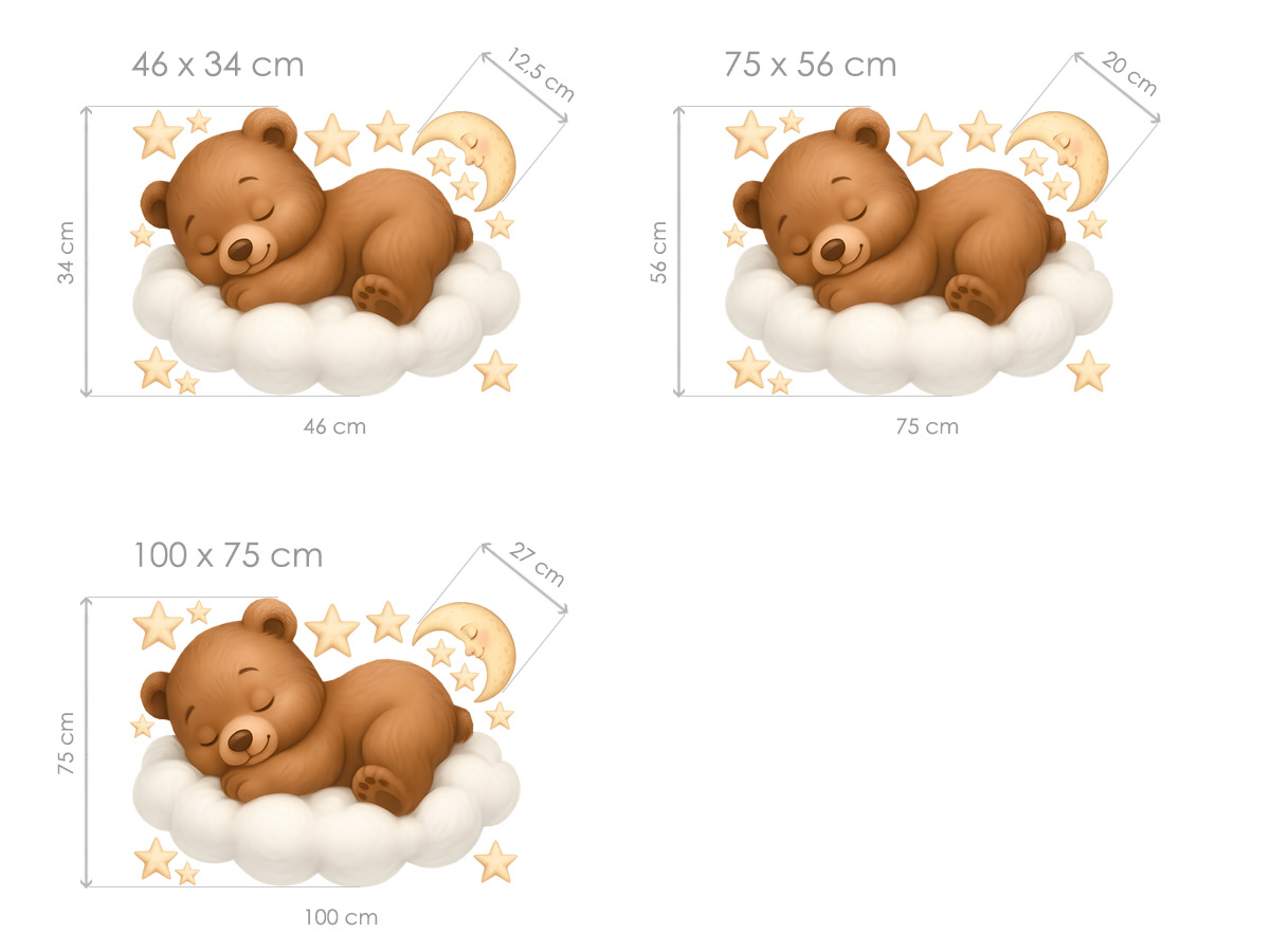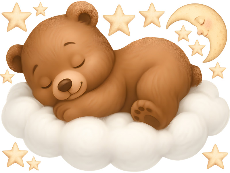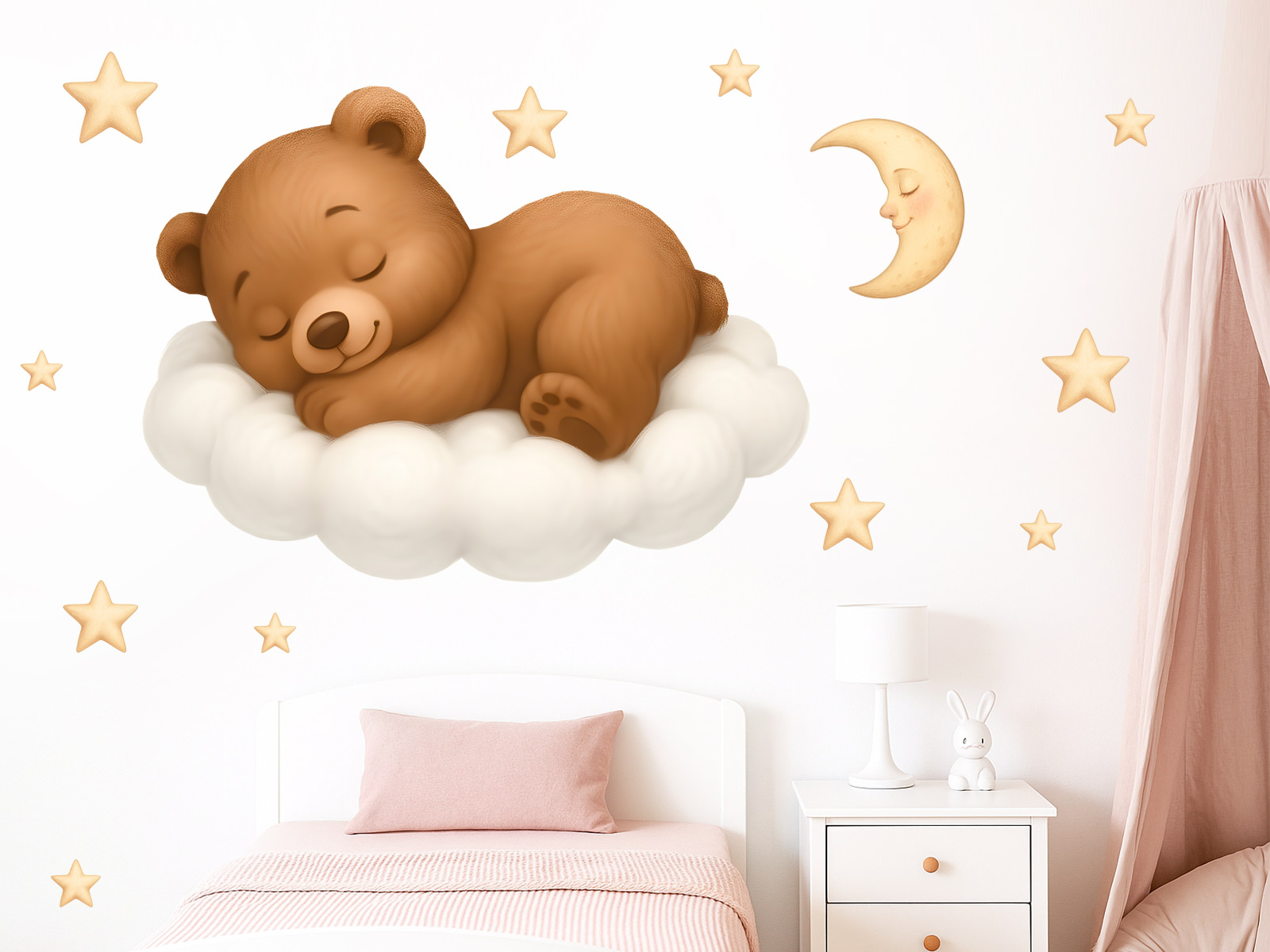 Samolepka na zeď „Medvídek na obláčku“ přináší do dětského pokojíčku jemnost, teplo a pocit naprostého bezpečí. Roztomilý spící medvídek stočený do klubíčka na nadýchaném obláčku působí uklidňujícím dojmem a vytváří atmosféru, která děti provází do říše snů. Pastelové barvy, měkoučké tvary a doplňující hvězdičky s usměvavým měsíčkem vytvářejí harmonický celek, který nádherně ladí s moderními interiéry. Po nalepení působí jako ručně malovaný detail přímo na zdi. Ideální pro prostor nad postýlkou, kout na spaní nebo relaxační zónu. Tato dekorace na zeď dodá pokoji hřejivý a snový charakter, který si zamilují děti i rodiče.
