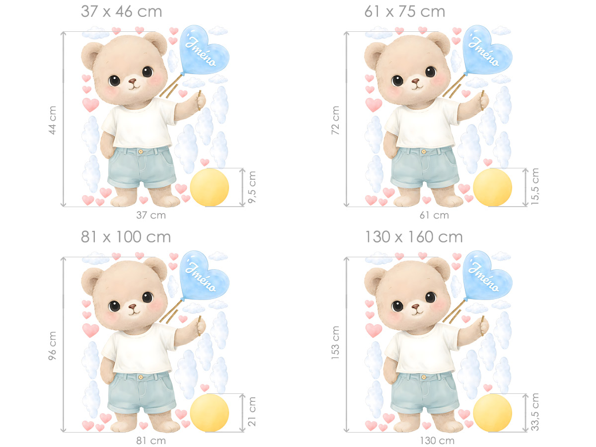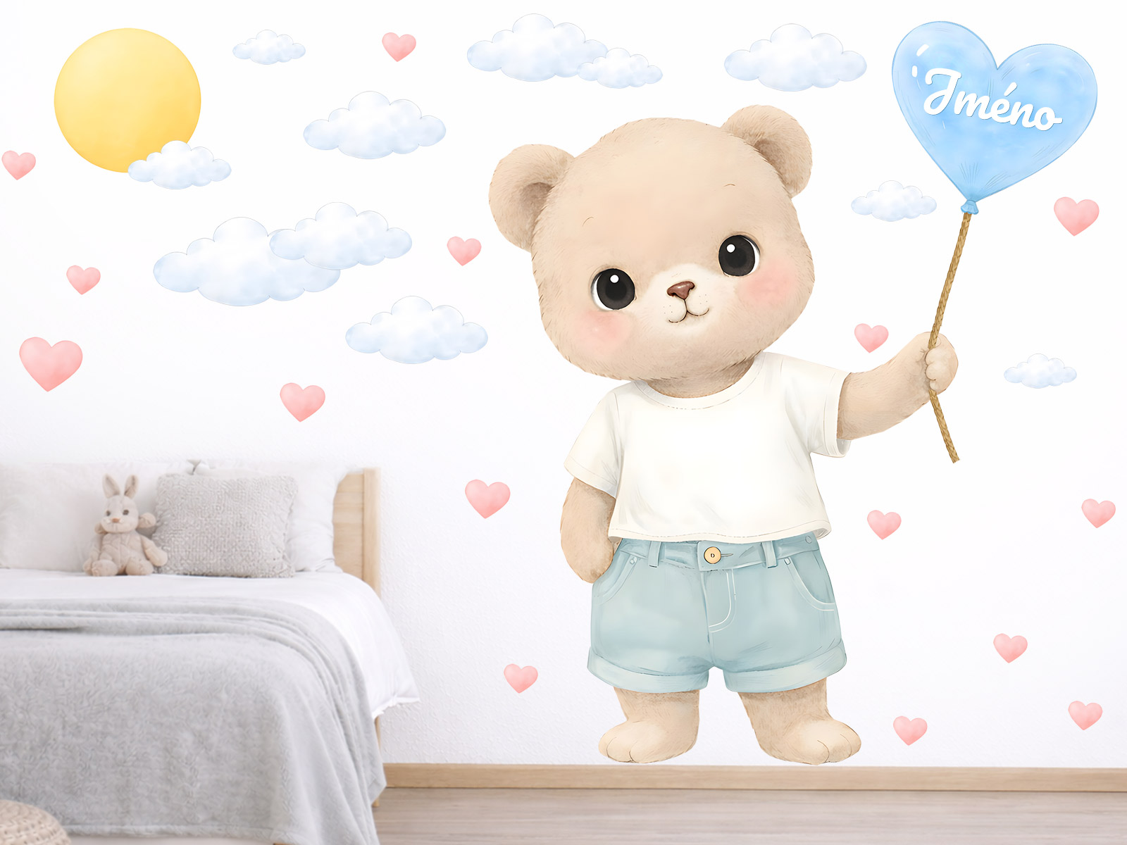 Jméno na přání v srdíčku-balónku lze samotné nebo kombinovat s datem narození nebo například věkem (tento údaj bude vycentrován pod jménem ve druhém řádku). Text zadejte ve 3. kroku objednávky do pole "poznámka". Máte-li speciální přání kontaktujte nás: info@nalepte.cz. Samolepka na zeď Medvídek s balónkem a jménem je něžnou a osobní dekorací, která dodá dětskému pokojíčku jedinečný charakter. Roztomilý medvídek s velkýma očima a jemným výrazem působí velmi přívětivě a vytváří příjemnou, uklidňující atmosféru. Medvídek drží balón ve tvaru srdce, do kterého lze doplnit jméno dítěte, čímž se dekorace stává krásným personalizovaným prvkem. Okolo se vznášejí jemné obláčky, srdíčka a sluníčko, které celou scénu doplňují o hravý a láskyplný nádech. Pastelové barvy a akvarelový styl zajišťují, že samolepka skvěle zapadne do moderních i klasických dětských interiérů. Jednotlivé prvky lze rozmístit podle vlastního prostoru a vytvořit tak originální kompozici na míru. Ideální dekorace pro miminka i malé děti, která spojuje roztomilý design s osobním detailem a vytvoří v pokojíčku pocit tepla a bezpečí.