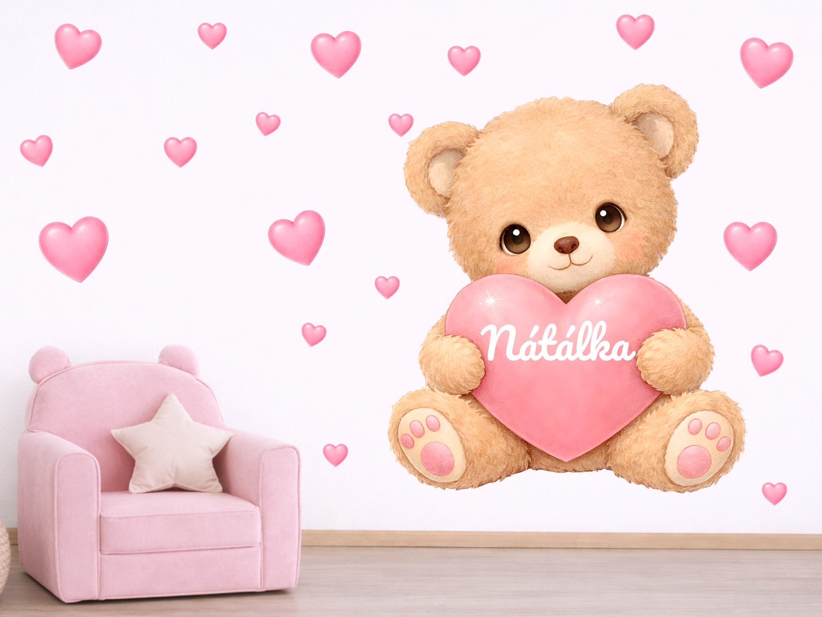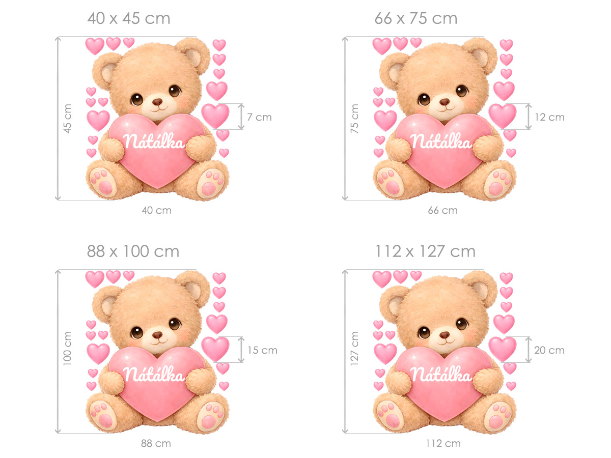 Jméno na přání v srdíčku lze samotné nebo kombinovat s datem narození nebo například věkem (tento údaj bude vycentrován pod jménem ve druhém řádku). Text zadejte ve 3. kroku objednávky do pole "poznámka". Máte-li speciální přání kontaktujte nás: info@nalepte.cz. Bude Vám zaslán náhled ke schválení emailem. Samolepka na zeď „Medvídek se srdíčkem a jménem“ vnese do dětského pokoje hřejivou atmosféru plnou něhy a radosti. Roztomilý medvídek s jemným, měkkým výrazem drží růžové srdíčko s vlastním jménem dítěte, kolem něj se vznášejí drobná srdíčka, která dotvářejí pocit lásky, bezpečí a pohody. Ilustrace je laděná do jemných pastelových tónů, působí přátelsky a harmonicky a krásně zapadne do dívčího i chlapeckého pokoje. Arch obsahuje hlavní motiv medvídka se jménem a doplňková srdíčka, díky kterým si lze vytvořit vlastní rozložení na zdi a dodat prostoru osobitý, hravý charakter. Samolepka je ideální jako originální dekorace nad postýlku, k hracímu koutku nebo jako milý dárek k narození miminka či narozeninám.