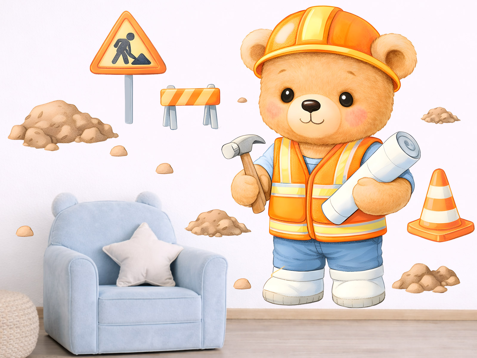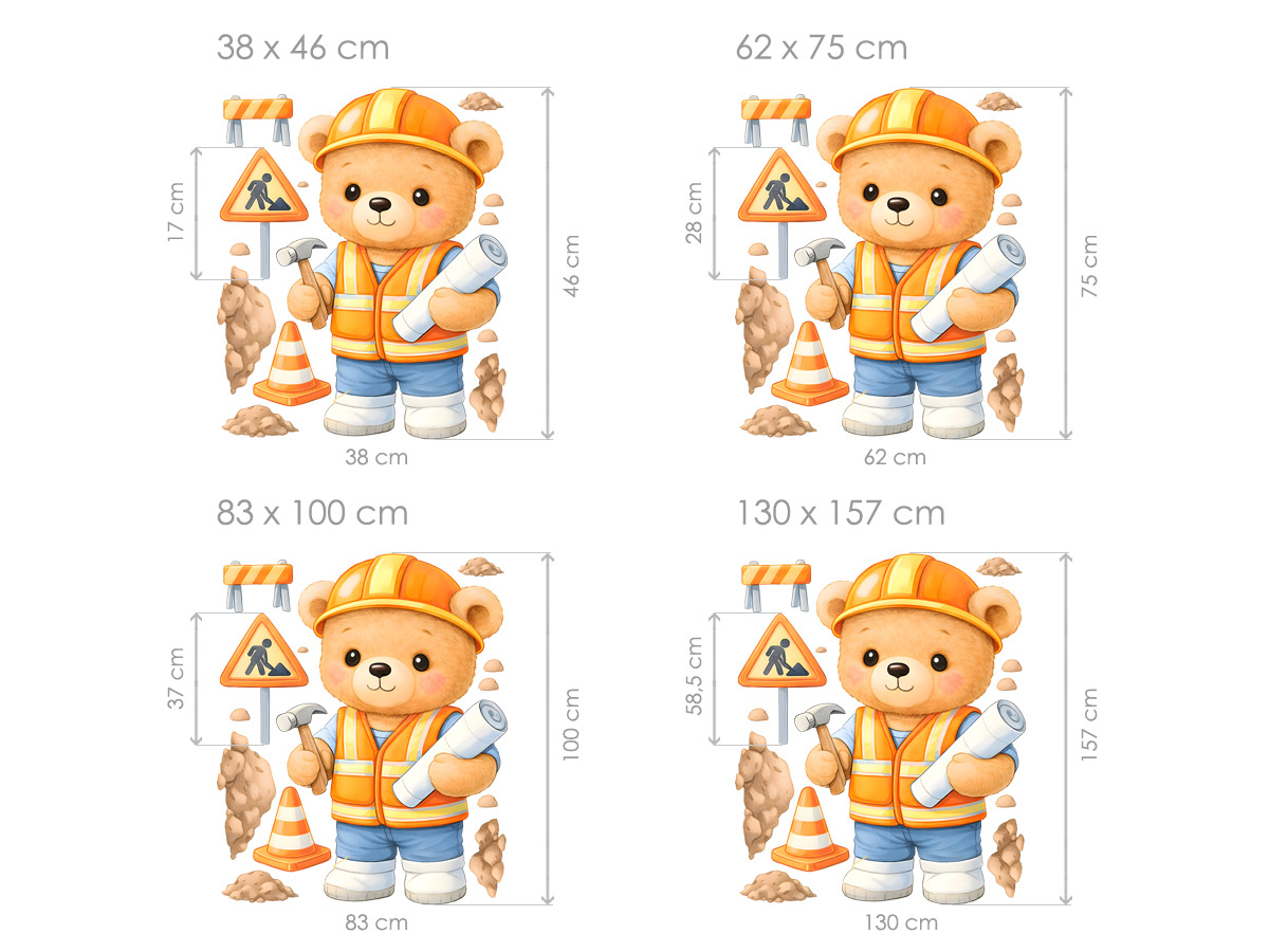 Samolepky na zeď Medvídek stavitel přenesou do dětského pokoje hravou atmosféru plnou fantazie a dobrodružství. Roztomilý medvídek v pracovním oblečení, s helmou a nářadím, působí přátelsky a povzbudivě a snadno si získá pozornost každého malého stavitele. Ilustrace je laděná do jemných, veselých barev, které pokoj krásně rozjasní, aniž by působily rušivě. Samolepka se skvěle hodí do klučičího pokoje, herny nebo dětského koutku a podporuje dětskou představivost, hru i zájem o objevování světa kolem sebe. Díky možnosti volby velikosti ji lze snadno přizpůsobit jak menším prostorům, tak i větší stěně nad postelí či hracím místem, kde se medvídek stavitel stane nepřehlédnutelným kamarádem na každý den.