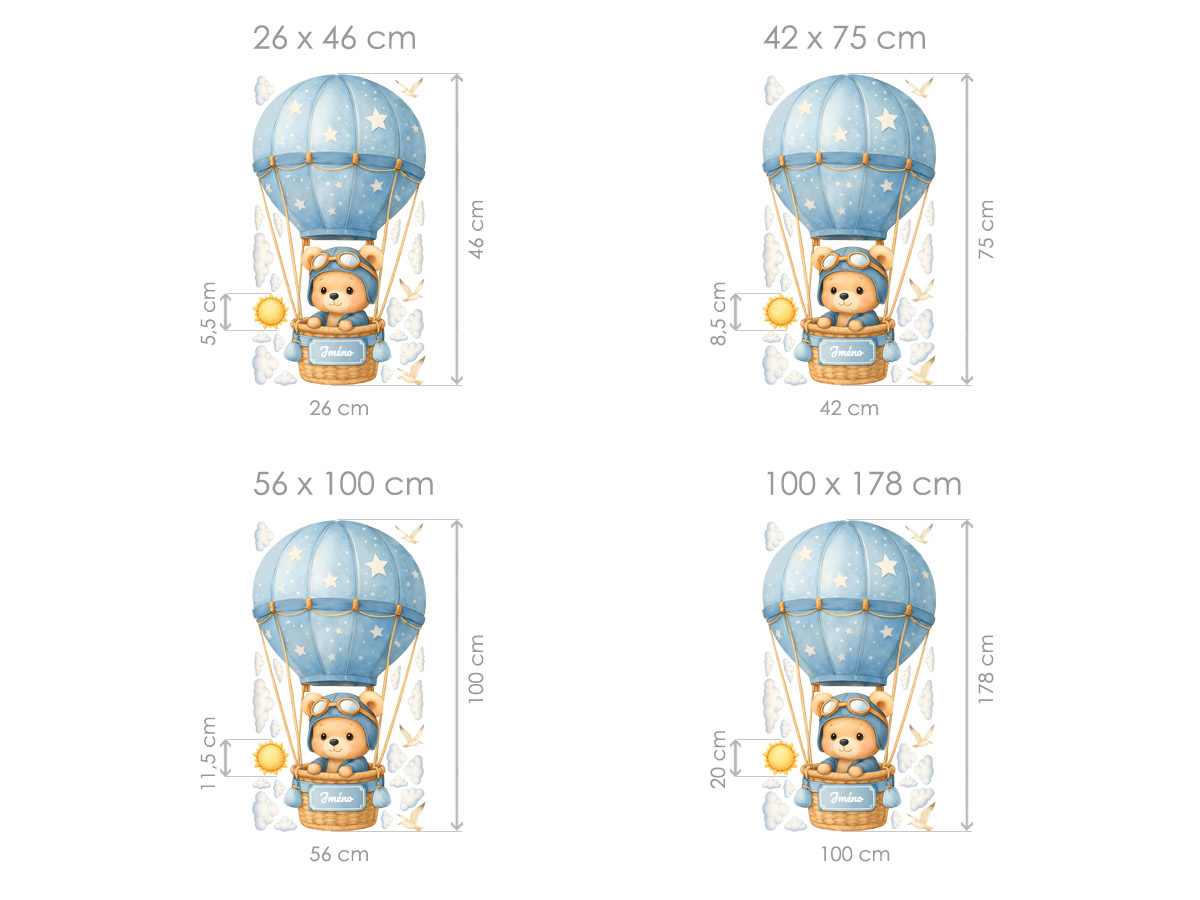 Jméno na přání na cedulce na koši létajícího horkovzdušného balónu lze s délkou do 12 znaků. Text zadejte ve 3. kroku objednávky do pole "poznámka". Máte-li speciální přání kontaktujte nás: info@nalepte.cz. Jemná dětská samolepka s roztomilým medvídkem letícím v horkovzdušném balónu promění dětský pokoj v místo plné snů a fantazie. Díky možnosti doplnění jména na košík balónu se stává osobní dekorací, která potěší každé dítě a dodá prostoru jedinečný charakter. Ilustrace v měkkých pastelových barvách s obláčky, ptáčky a sluníčkem působí klidně a harmonicky, ideální nad postýlku nebo do herního koutku. Samolepka je navržena tak, aby krásně vynikla samostatně i v kombinaci s dalšími prvky a rostla spolu s dětským pokojíčkem.