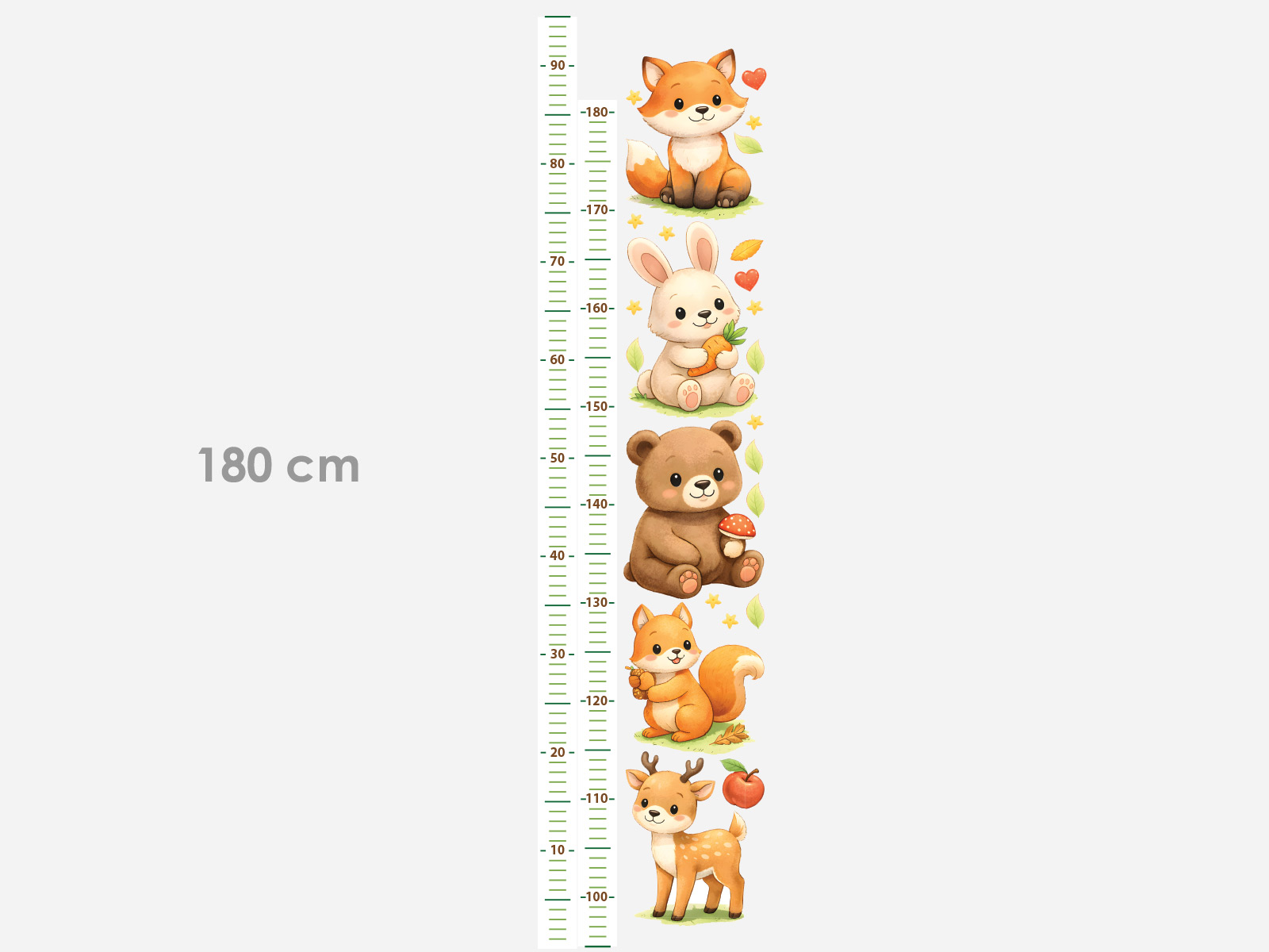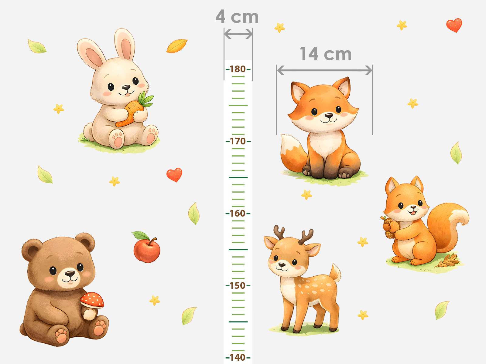 Kolem výškového metru jsou rozmístěna roztomilá lesní zvířátka, jako je zajíček, medvídek, liška, srneček a veverka. Celou kompozici doplňují jemné detaily v podobě listů, hvězdiček, srdíček a drobných přírodních prvků, které dodávají dekoraci hravý a hřejivý nádech.