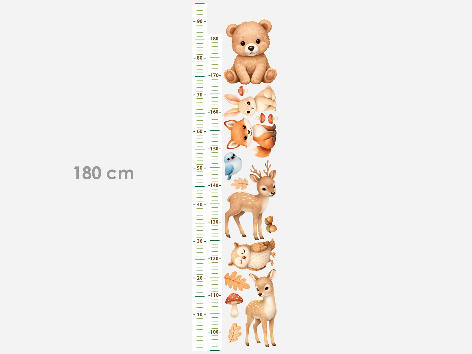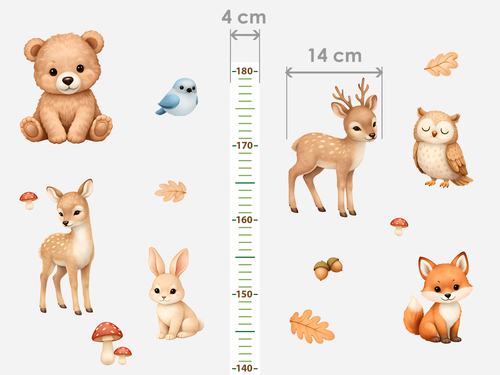 Kolem výškového metru jsou rozmístěna roztomilá lesní zvířátka, jako je medvídek, srneček, zajíček, liška nebo sovička. Celou scénu doplňují jemné detaily v podobě listů, žaludů, hub a malého ptáčka, které podtrhují přírodní charakter motivu.