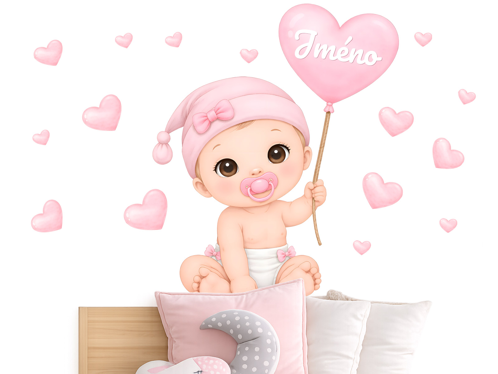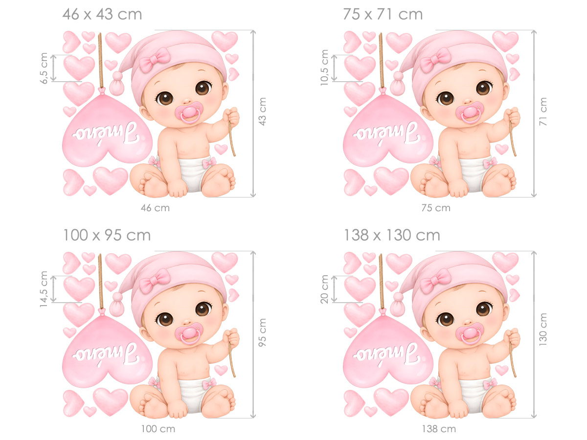 Jméno na přání v srdíčku lze samotné nebo kombinovat s datem narození nebo například věkem (tento údaj bude vycentrován pod jménem ve druhém řádku). Text zadejte ve 3. kroku objednávky do pole "poznámka". Máte-li speciální přání kontaktujte nás: info@nalepte.cz. Samolepky na zeď Miminko holka se jménem jsou něžnou a osobitou dekorací, která dodá dětskému pokoji jemnou a láskyplnou atmosféru. Roztomilé miminko v pastelových růžových tónech drží srdíčkový balónek se jménem, čímž vzniká krásný personalizovaný prvek. Motiv doplňují drobná srdíčka, která působí hravě a zároveň uklidňujícím dojmem. Celý design je laděný do jemných barev, které vytvářejí příjemné prostředí ideální pro miminka. Dekorace se skvěle hodí nad postýlku nebo do dětského koutku, kde vytvoří útulnou a harmonickou atmosféru. Díky možnosti doplnění jména se stává i krásnou vzpomínkou a jedinečným doplňkem každého pokojíčku.