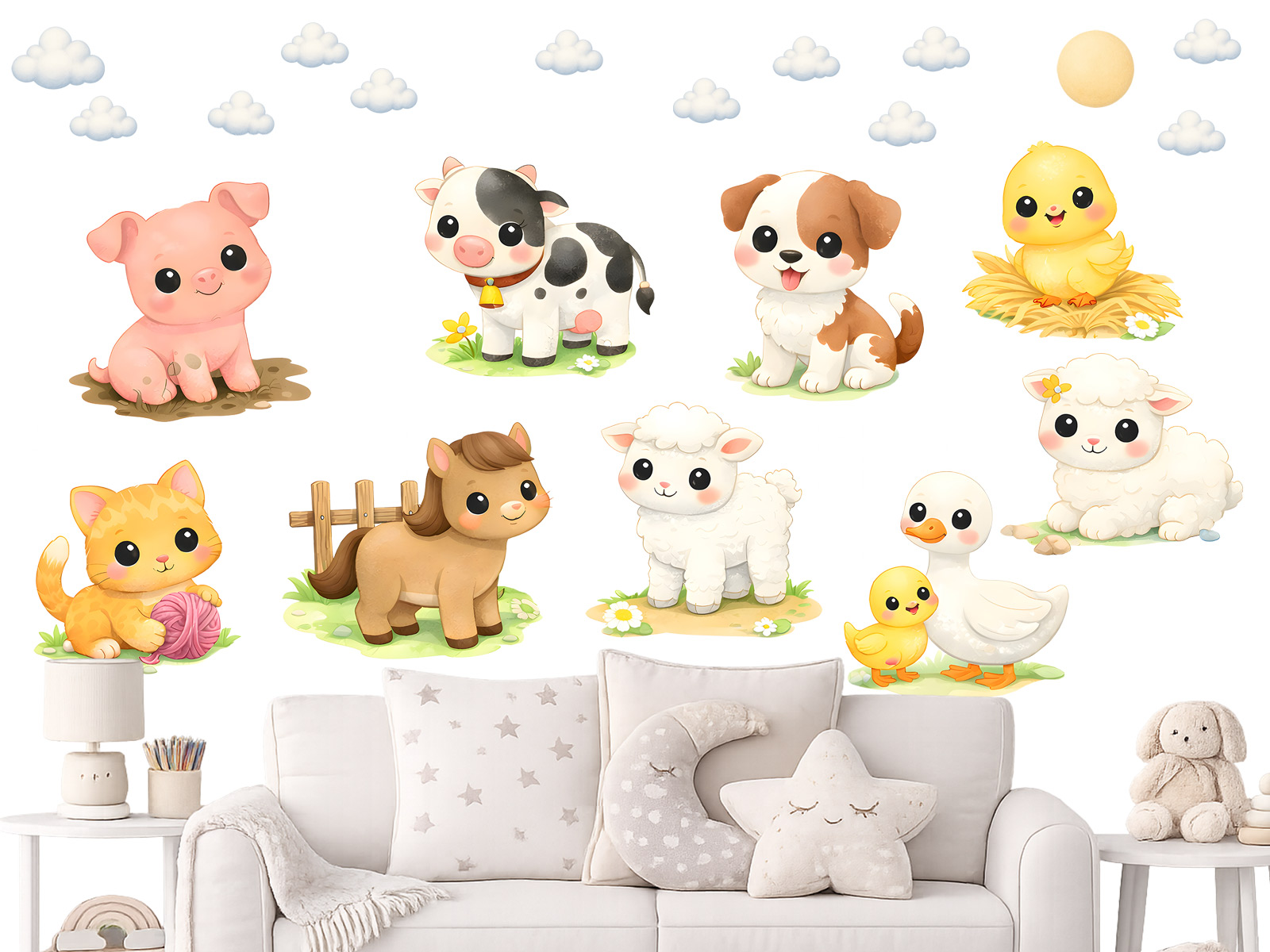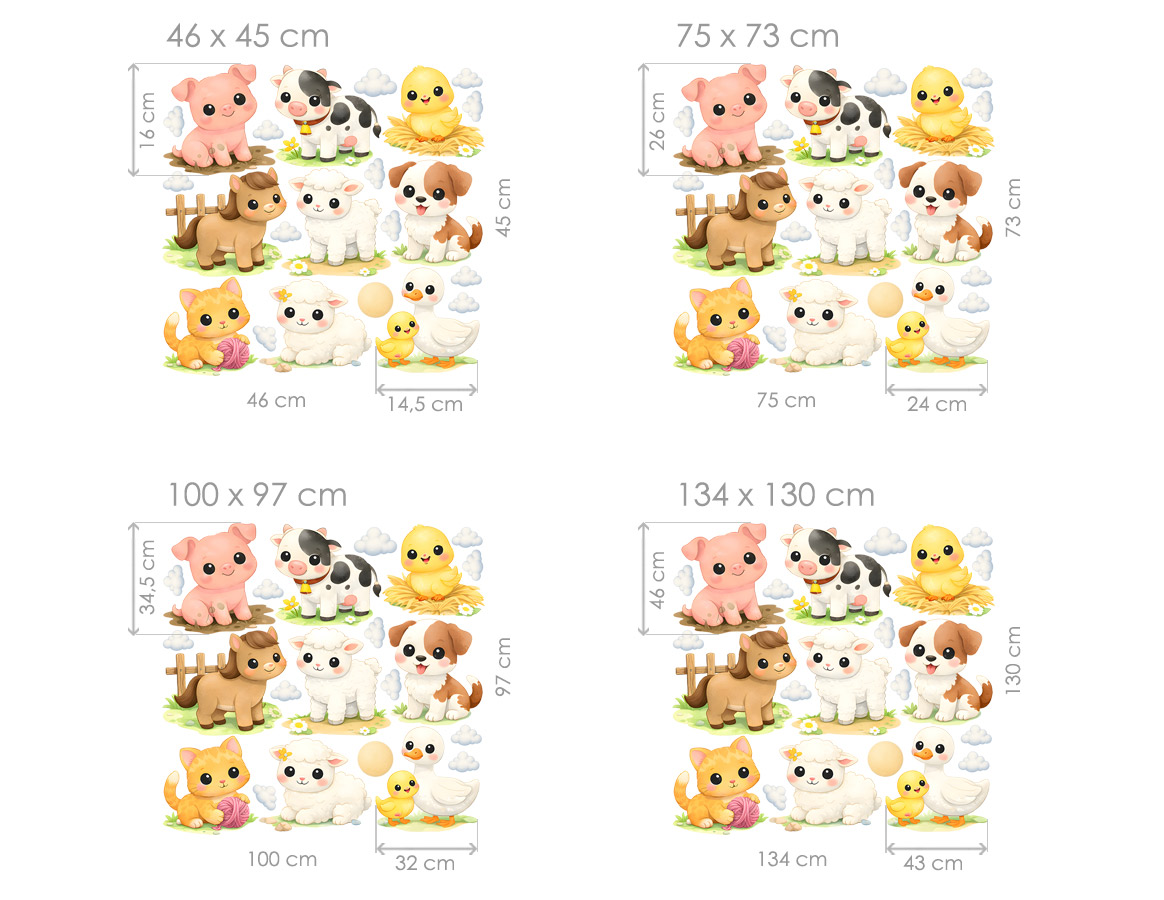 Samolepky na zeď Mláďata z farmy přinesou do dětského pokoje veselou venkovskou atmosféru plnou roztomilých zvířátek. Ilustrace malých farmářských mláďátek působí mile a přátelsky, takže okamžitě vytvoří hravou a útulnou dekoraci. Na motivu najdete různá zvířátka ze statku – prasátko, kravičku, pejska, ovečky, koťátko, hříbátko, kuřátko i husu s malým housátkem. Celou scénu doplňují drobné detaily, jako jsou obláčky, sluníčko nebo květiny, které dodávají dekoraci jemný a radostný charakter. Tato dekorace je ideální do dětského pokoje, pokoje pro miminko nebo do hracího koutku. Roztomilá farmářská zvířátka vytvoří příjemnou atmosféru plnou pohody a fantazie a promění pokoj v malý veselý statek.