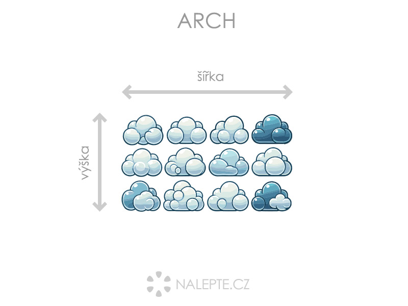Arch = takto vám bude samolepka doručena. Každý prvek na archu je samostatná samolepka, jednotlivé části jednoduše od papírového podkladu odlepíte a nalepíte na zeď tak, aby složily výsledný motiv dle Vašich představ. Arch si můžete prohlédnout ve fotogalerii. Rozměr archu volíte v objednávce. Přehled předdefinovaných rozměrů (šířka x výška): a) arch 46 x 26 cm b) arch 75 x 43 cm c) arch 100 x 57 cm d) arch 130 x 74 cm Je možné zvolit i libovolný vlastní rozměr archu pomocí posuvníku či klikání na "Větší", "Menší" šířka jednoho mráčku odpovídá zhruba 1/4 šířky zvoleného archu.