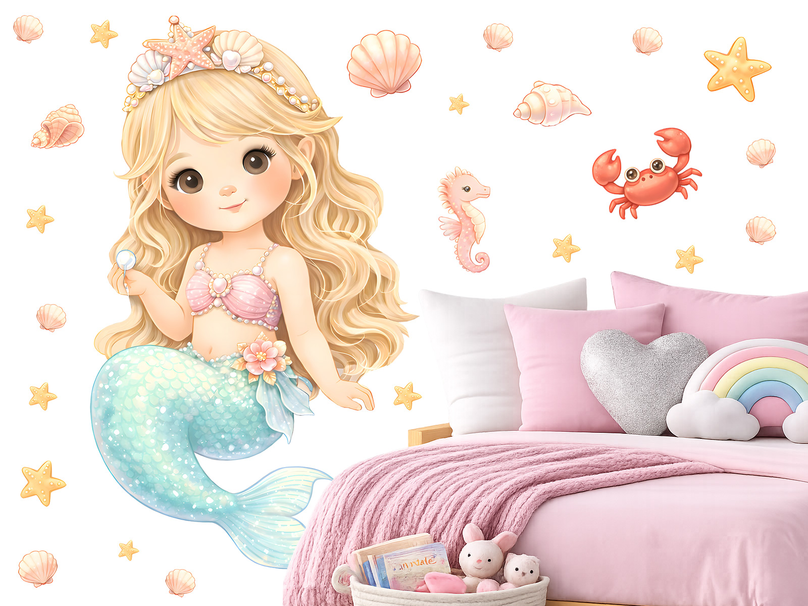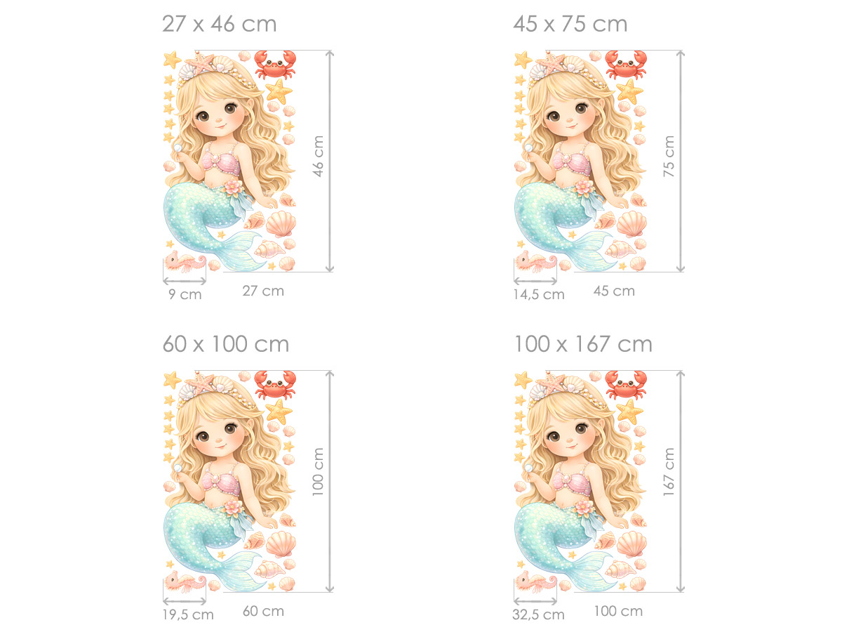 Samolepky na zeď „Mořská víla“ přenesou dětský pokoj do kouzelného podmořského světa plného fantazie a jemných detailů. Roztomilá mořská víla s dlouhými vlasy, třpytivým ocasem a mušličkami okolo působí něžně, pohádkově a zároveň hravě, takže si ji zamilují malé snílky i milovníci moře. Motiv je doplněný o drobné mořské prvky, které lze rozmístit podle vlastní fantazie a vytvořit tak jedinečnou dekoraci na stěně nad postýlkou, postelí nebo v herním koutku. Díky jemným pastelovým barvám samolepky krásně zapadnou do holčičího pokoje, dodají mu lehkost, radostnou atmosféru a podpoří dětskou představivost i chuť vymýšlet vlastní pohádky o mořských princeznách a tajemném světě pod hladinou.