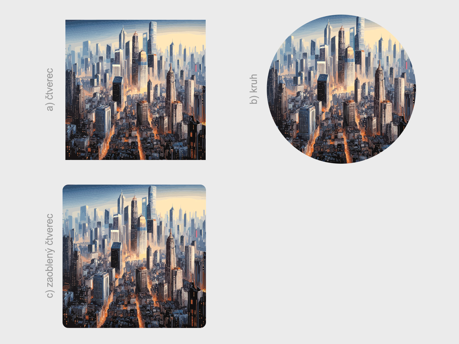 Tvar je možné změnit. Lze vybrat a) čtverec, b) kruh, c) zaoblený čtverec viz fotogalerie. Pokud tedy máte zájem o jiný tvar než na hlavní fotografii, stačí v posledním kroku objednávky do pole poznámka napsat např. "kruh". Jedná se o tištěný samolepící plakát - imitace malby Je možné zvolit i libovolný vlastní rozměr archu pomocí posuvníku či klikání na "Větší", "Menší"