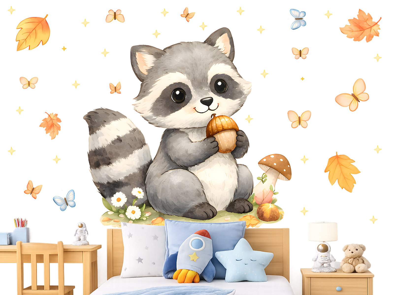 Mýval z lesa je něžná dětská samolepka na zeď, která promění pokojíček v kouzelný les plný klidu a fantazie. Roztomilý mýval s velkýma očima, obklopený podzimními lístky, motýlky a drobnými detaily, vytváří hřejivou a přátelskou atmosféru, ve které se děti budou cítit bezpečně a spokojeně. Samolepka je navržena v jemných pastelových barvách, které neruší interiér a snadno se kombinují s ostatním vybavením dětského pokoje. Hodí se nad postýlku, ke stolečku i do hracího koutku a podpoří dětskou představivost i lásku k přírodě. Díky kvalitnímu zpracování a jednoduché aplikaci je ideální volbou pro rodiče, kteří chtějí pokojíček rychle a stylově oživit.