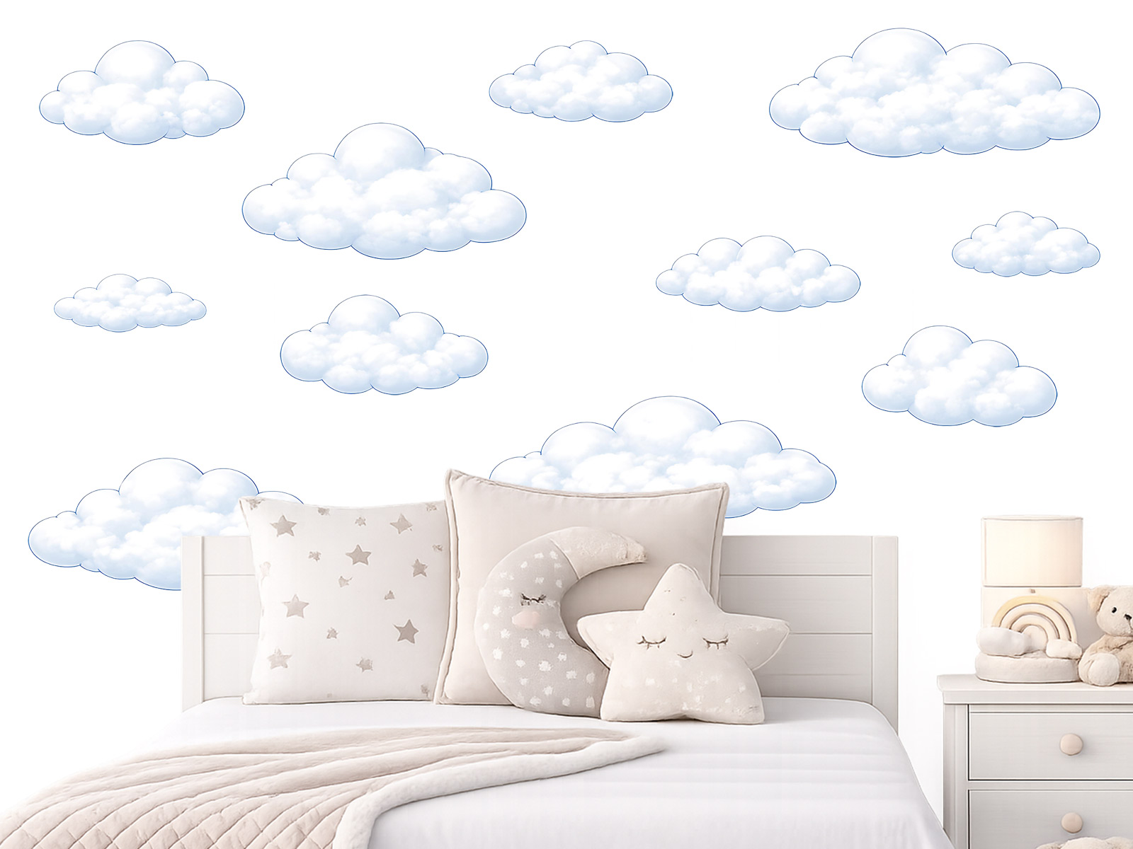 Oblaka jsou jemné dětské samolepky na zeď s lehkými, nadýchanými obláčky, které vytvářejí klidnou a snovou atmosféru v dětském pokoji. Akvarelový styl s měkkými přechody a světle modrými konturami působí vzdušně, přirozeně a neruší prostor, naopak ho opticky zjemňuje a otevírá. Obláčky jsou navrženy v různých velikostech, takže si můžete vytvořit vlastní rozložení přesně podle dispozice pokoje – rozptýlené po celé stěně, nad postýlkou nebo jako decentní doplněk k dalším motivům. Celek působí harmonicky, hravě a nadčasově, ideální pro miminka i větší děti, a krásně ladí s neutrálním i barevným interiérem. Samolepka přináší pocit klidu, bezpečí a fantazie, jako by se dítě ocitlo v měkkém světě oblaků.