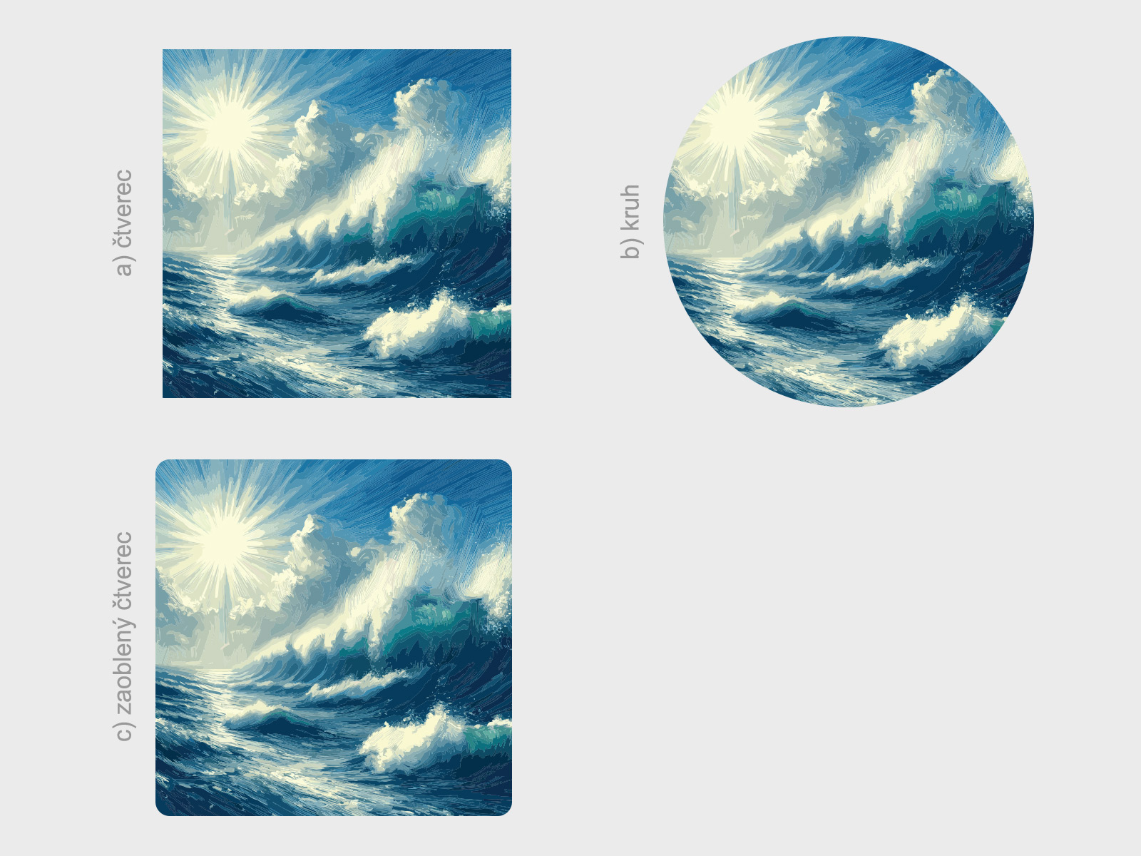 Tvar je možné změnit. Lze vybrat a) čtverec, b) kruh, c) zaoblený čtverec viz fotogalerie. Pokud tedy máte zájem o jiný tvar než na hlavní fotografii, stačí v posledním kroku objednávky do pole poznámka napsat např. "kruh". Jedná se o tištěný samolepící plakát - imitace malby Je možné zvolit i libovolný vlastní rozměr archu pomocí posuvníku či klikání na "Větší", "Menší"