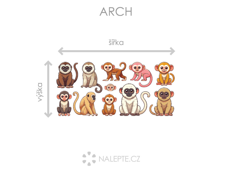 Arch = takto vám bude samolepka doručena. Každý prvek na archu je samostatná samolepka, jednotlivé části jednoduše od papírového podkladu odlepíte a nalepíte na zeď tak, aby složily výsledný motiv dle Vašich představ. Arch si můžete prohlédnout ve fotogalerii. Rozměr archu volíte v objednávce. Přehled předdefinovaných rozměrů (šířka x výška): a) arch 46 x 21 cm b) arch 75 x 34 cm c) arch 100 x 46 cm d) arch 130 x 60 cm Je možné zvolit i libovolný vlastní rozměr archu pomocí posuvníku či klikání na "Větší", "Menší"