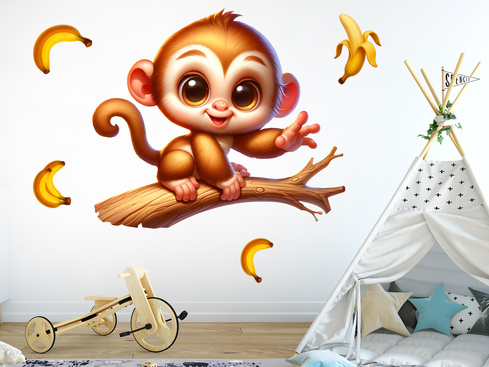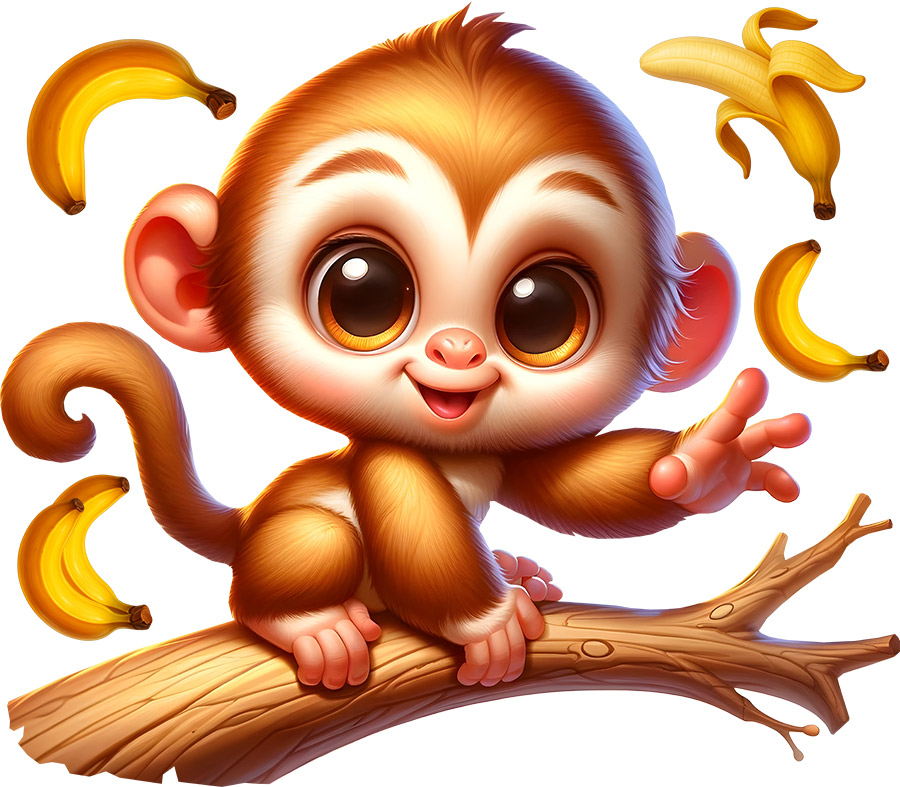 Samolepka na zeď Opička na větvi vnese do dětského pokoje hravou radost, teplo a úsměv na tváři při každém pohledu. Roztomilá opička s velkýma zvídavýma očima, sedící na větvi a obklopená poletujícími banány, působí přátelsky, živě a plná energie. Jemné barevné tóny a měkké tvary vytvářejí útulnou atmosféru, která podporuje fantazii, hravost i pocit bezpečí. Motiv se snadno stane veselým středobodem místnosti, ať už nad postýlkou, postelí nebo v hracím koutku, a přirozeně zapadne do moderního i pohádkového interiéru. Opička na větvi je ideálním společníkem pro malé objevitele, kteří milují zvířátka, dobrodružství a svět plný barev a úsměvů.