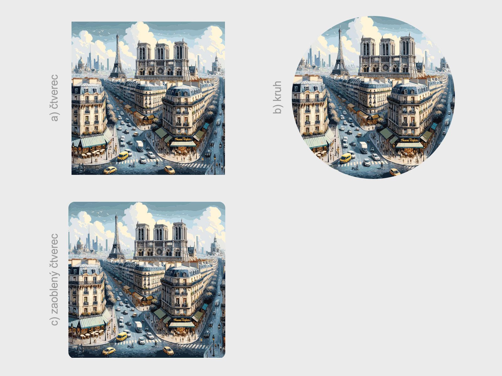 Tvar je možné změnit. Lze vybrat a) čtverec, b) kruh, c) zaoblený čtverec viz fotogalerie. Pokud tedy máte zájem o jiný tvar než na hlavní fotografii, stačí v posledním kroku objednávky do pole poznámka napsat např. "čtverec". Jedná se o tištěný samolepící plakát - imitace malby Je možné zvolit i libovolný vlastní rozměr archu pomocí posuvníku či klikání na "Větší", "Menší"