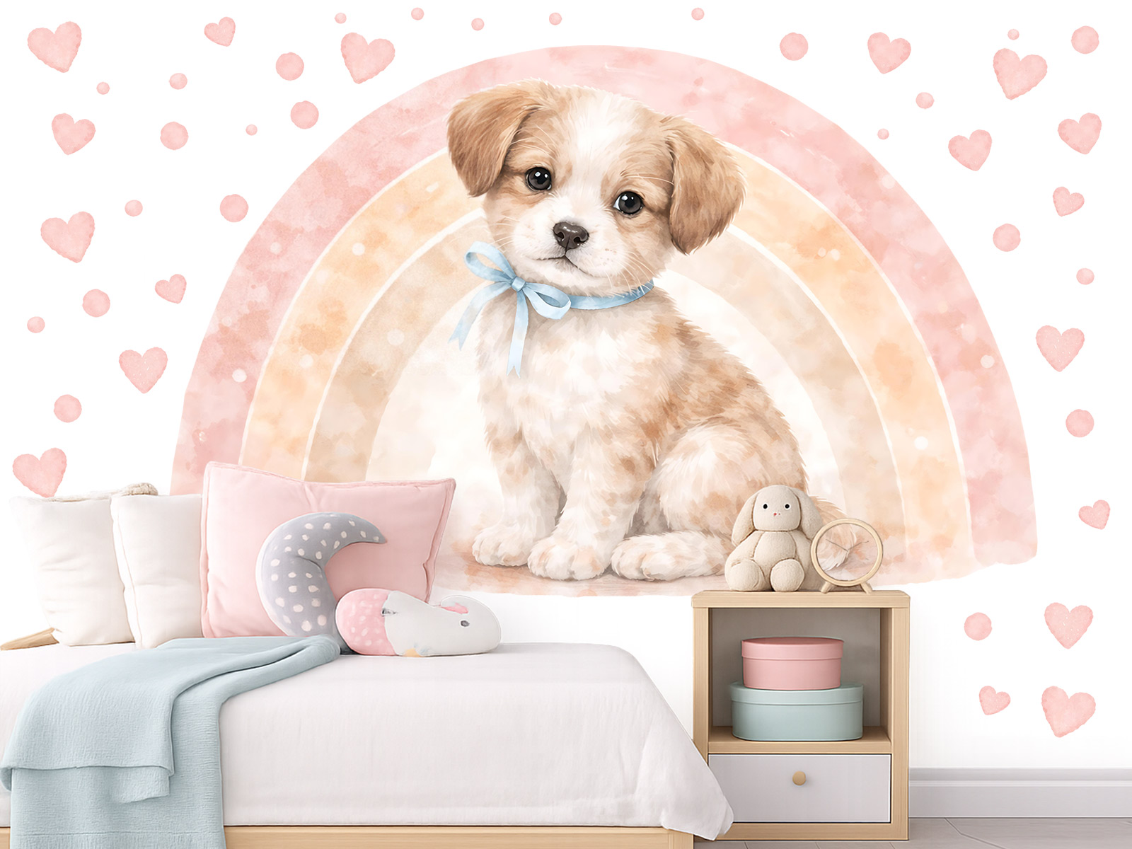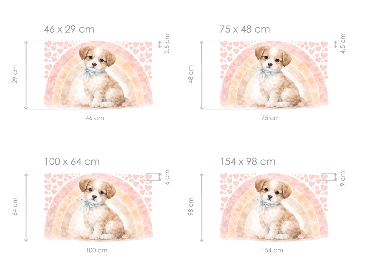 Samolepka na zeď „Duha a pejsek“ přináší do dětského pokoje něžnou, pohádkovou atmosféru plnou klidu, radosti a jemných emocí. Roztomilé štěňátko s hebkým výrazem je zasazeno do pastelové duhy v růžových a broskvových tónech, doplněné drobnými srdíčky, které celý motiv působivě zjemňují a dodávají mu láskyplný charakter. Ilustrace je laděná do akvarelového stylu s měkkými přechody a světlými barvami, díky čemuž se krásně hodí do holčičího pokoje, koutku pro miminko nebo klidové zóny pro nejmenší děti. Motiv působí hřejivě, útulně a snadno se stane dominantou prostoru, která podporuje pocit bezpečí a pohody. Arch obsahuje jednotlivé prvky v přehledném uspořádání a je dostupný ve více velikostech, takže si lze snadno vybrat variantu odpovídající velikosti stěny i celkovému pojetí interiéru.