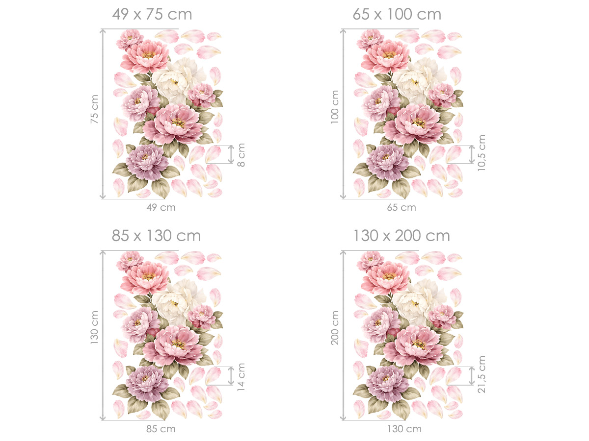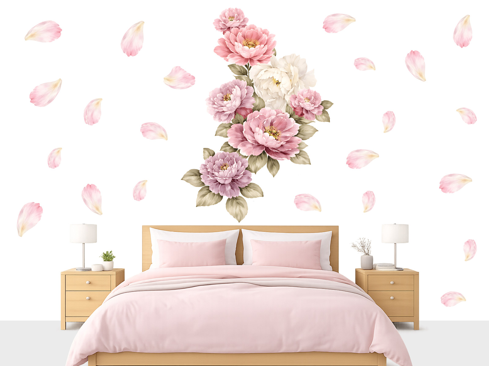 Samolepka na zeď Pivoňky přináší do interiéru jemnou eleganci, romantiku a nadčasovou krásu květin. Bohatá kompozice květů v růžových a krémových tónech působí harmonicky a vytváří výrazný, přesto velmi něžný dekorativní prvek. Akvarelové zpracování zvýrazňuje detailní strukturu okvětních lístků i přirozené odstíny barev, které se mezi sebou jemně prolínají. Doplňující poletující lístky dodávají celé kompozici lehkost a vzdušnost. Díky centrálnímu uspořádání květin vzniká efektní dominantní dekorace, kterou lze snadno umístit například nad postel nebo pohovku. Samolepka se skvěle hodí do ložnice, obývacího pokoje i dalších interiérů, kde chcete vytvořit klidnou a útulnou atmosféru. Ideální volba pro milovníky květinových motivů, kteří hledají elegantní a zároveň výraznou dekoraci s nádechem luxusu.