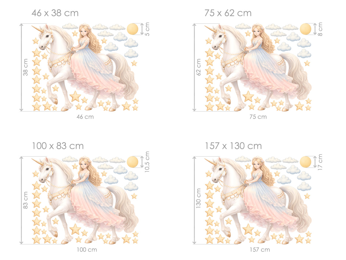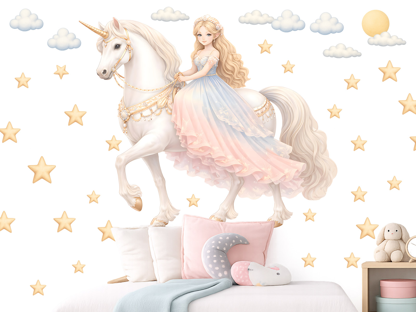 Samolepka na zeď Princezna na bílém jednorožci přináší do dětského pokoje kouzelnou pohádkovou atmosféru plnou elegance a snění. Něžná princezna v jemných pastelových šatech sedí na krásném bílém jednorožci, který působí majestátně a zároveň velmi jemně. Celá ilustrace je laděná do světlých, harmonických tónů s lehkým akvarelovým efektem, který dodává dekoraci vzdušnost a pohádkový nádech. Okolní hvězdičky, obláčky a sluníčko doplňují scénu a vytvářejí příjemné, snové prostředí. Detailní zpracování, jemné přechody barev a elegantní styl dělají z této samolepky výrazný prvek, který krásně vynikne nad postelí nebo v herním koutku. Jednotlivé prvky lze rozmístit podle vlastního prostoru a vytvořit si tak originální kompozici. Ideální dekorace pro malé princezny, které milují pohádky, jednorožce a kouzelný svět plný fantazie.