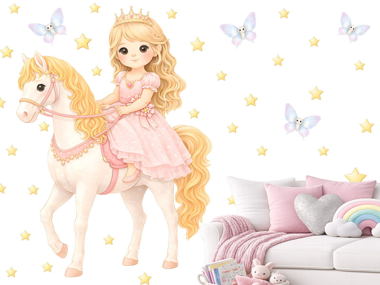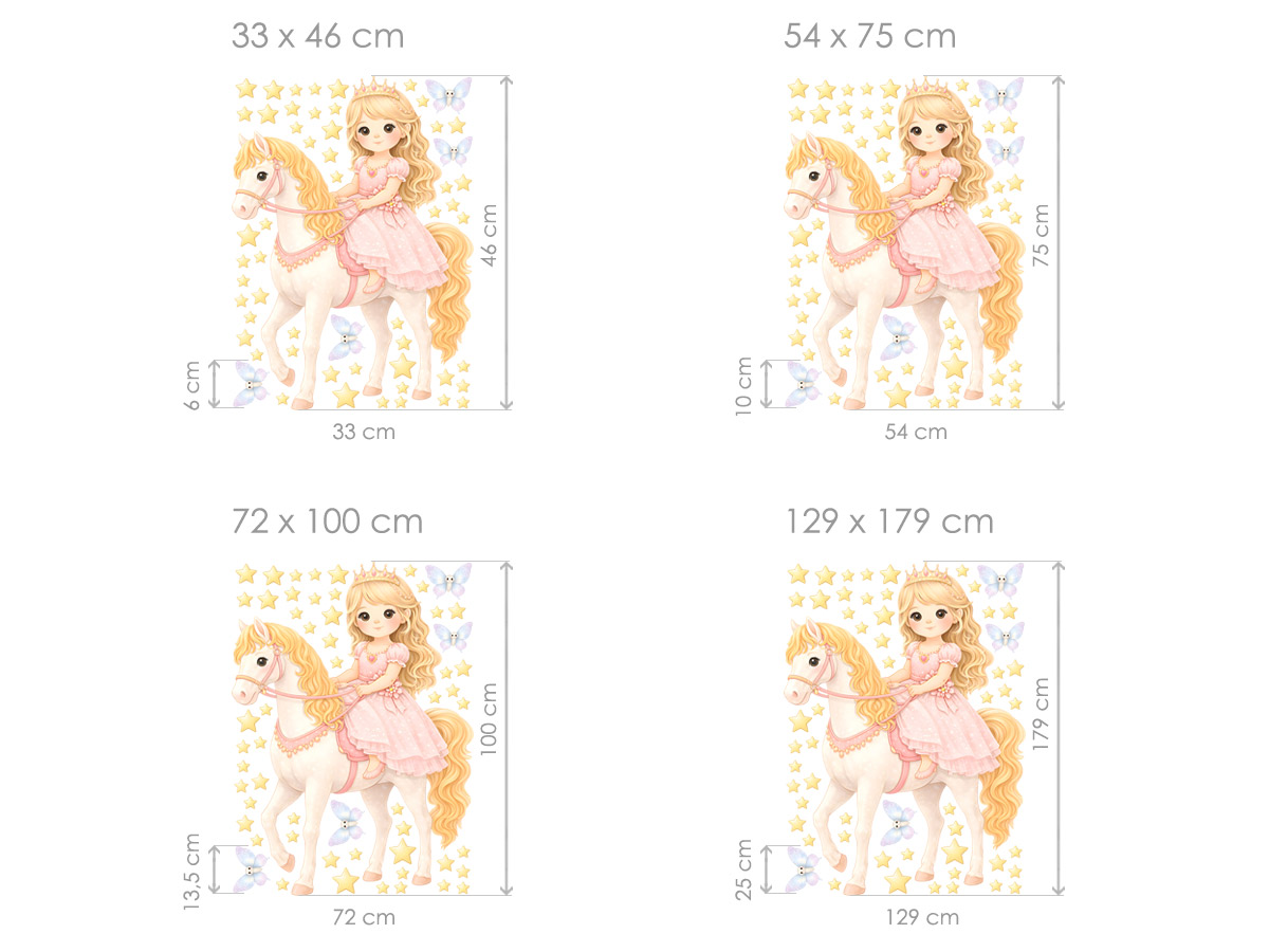 Samolepky na zeď Princezna na koni přenesou dětský pokoj do světa pohádek, fantazie a jemné elegance. Kouzelná ilustrace princezny jedoucí na krásném koni, doplněná hvězdičkami a drobnými motýlky, působí lehce, snově a velmi něžně. Pastelové barvy a přátelský výraz postaviček vytvářejí harmonickou atmosféru, která je ideální pro holčičí pokoj, herní koutek nebo prostor u postýlky. Samolepky lze snadno rozmístit podle vlastní představy, krásně vyniknou jako hlavní motiv na zdi a podporují dětskou fantazii, pohádkové příběhy i pocit bezpečí a radosti. Tento motiv se skvěle hodí pro všechny malé milovnice princezen, koní a kouzelných světů.