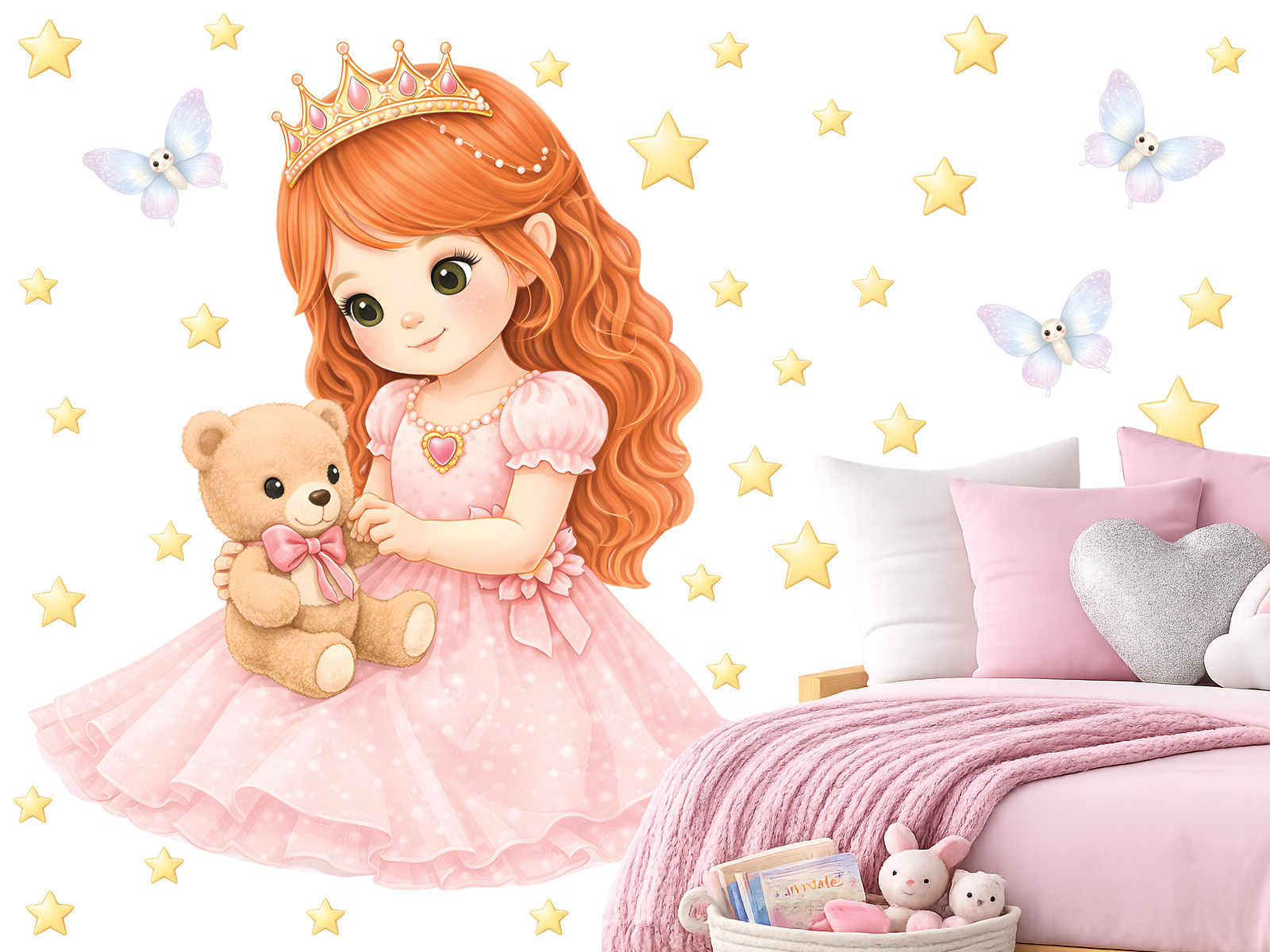 Samolepky na zeď Princezna s medvídkem přinesou do dětského pokoje jemnou pohádkovou atmosféru plnou něhy, klidu a fantazie. Roztomilá princezna v růžových šatech s korunkou a milým medvídkem v náručí působí velmi hřejivě a bezpečně, díky čemuž je motiv ideální zejména pro holčičí pokojíček, k postýlce nebo do hracího koutku. Pastelové barvy, jemné detaily a hvězdičky s vílami kolem postavičky krásně doplní světlý interiér a vytvoří kouzelné prostředí, ve kterém se bude dítě cítit příjemně a spokojeně. Samolepka podporuje dětskou představivost, navozuje pohádkový svět plný snů a je vhodná jak pro malé princezny, tak i pro předškolní děti. Motiv lze snadno kombinovat s dalšími dekoracemi ve stejném stylu a vytvořit tak harmonický a útulný dětský pokoj.