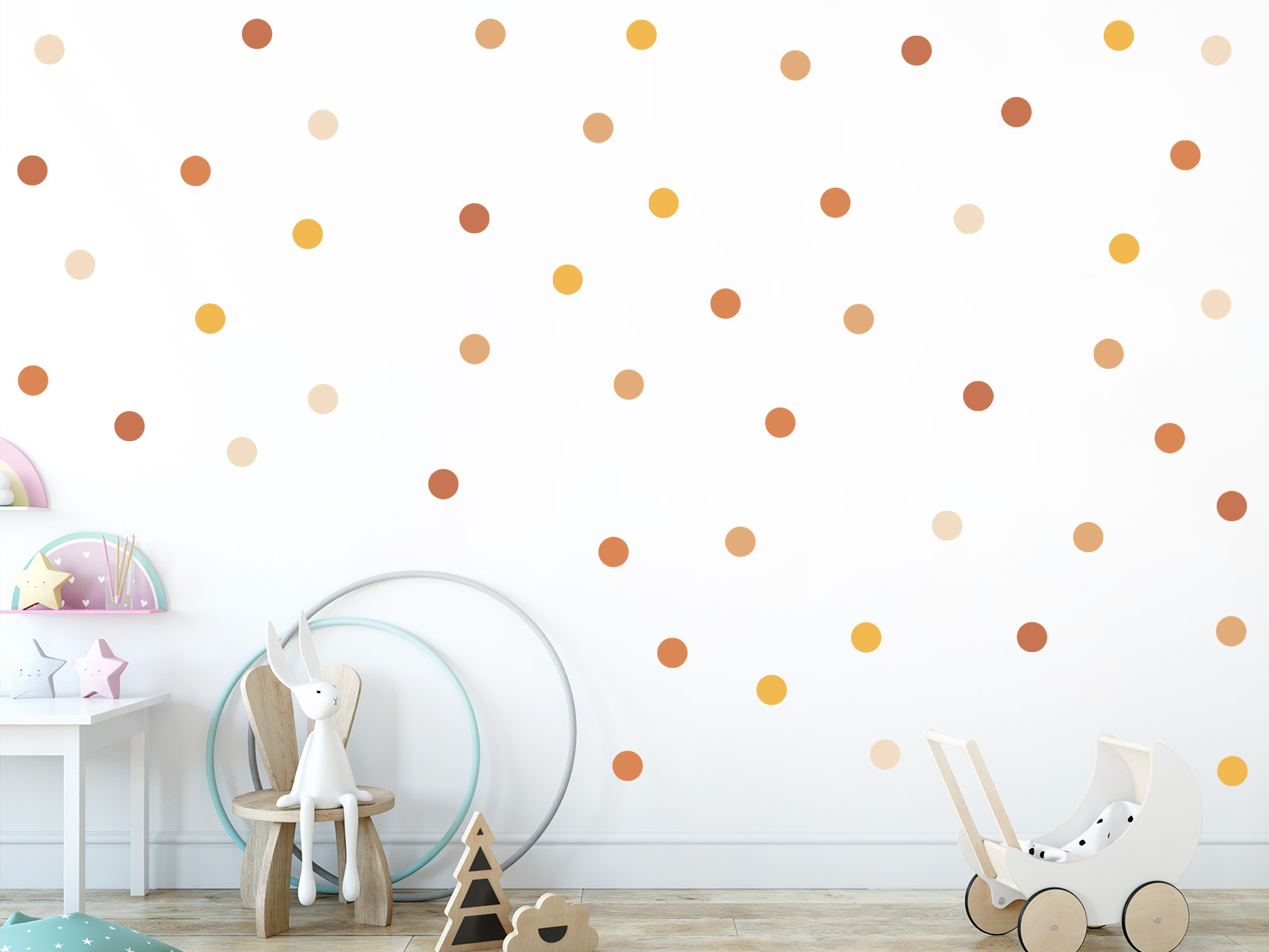 Vytvořte hřejivou, útulnou a přirozeně laděnou atmosféru v dětském pokoji i obytném interiéru se sadou Puntíky boho. Puntíky v jemných zemitých odstínech béžové, pískové, terakotové a teplé hořčicové barvy působí harmonicky, klidně a dodají prostoru měkký dekorativní akcent inspirovaný boho stylem a přírodou. Každý arch obsahuje 50 puntíků v plynulém barevném přechodu od světlých krémových tónů přes teplé karamelové a hliněné odstíny až po sytější zlatavé barvy. Díky této promyšlené paletě působí výsledná kompozice přirozeně a vyváženě, krásně ladí se světlým i tmavším dřevem, přírodními textiliemi a neutrálním nábytkem. Puntíky se skvěle hodí do dětských pokojů, ložnic, heren i klidových koutků, kde podtrhnou uvolněnou atmosféru a nadčasový boho charakter. Skvěle se hodí pro: - dětské pokoje v teplých, zemitých a přírodních tónech - kombinaci s dřevem, béžovými, krémovými nebo bílými stěnami - interiéry v boho, přírodním, nordic nebo minimalistickém stylu
