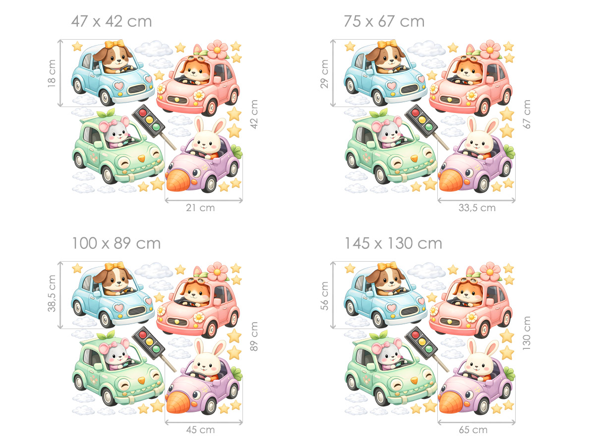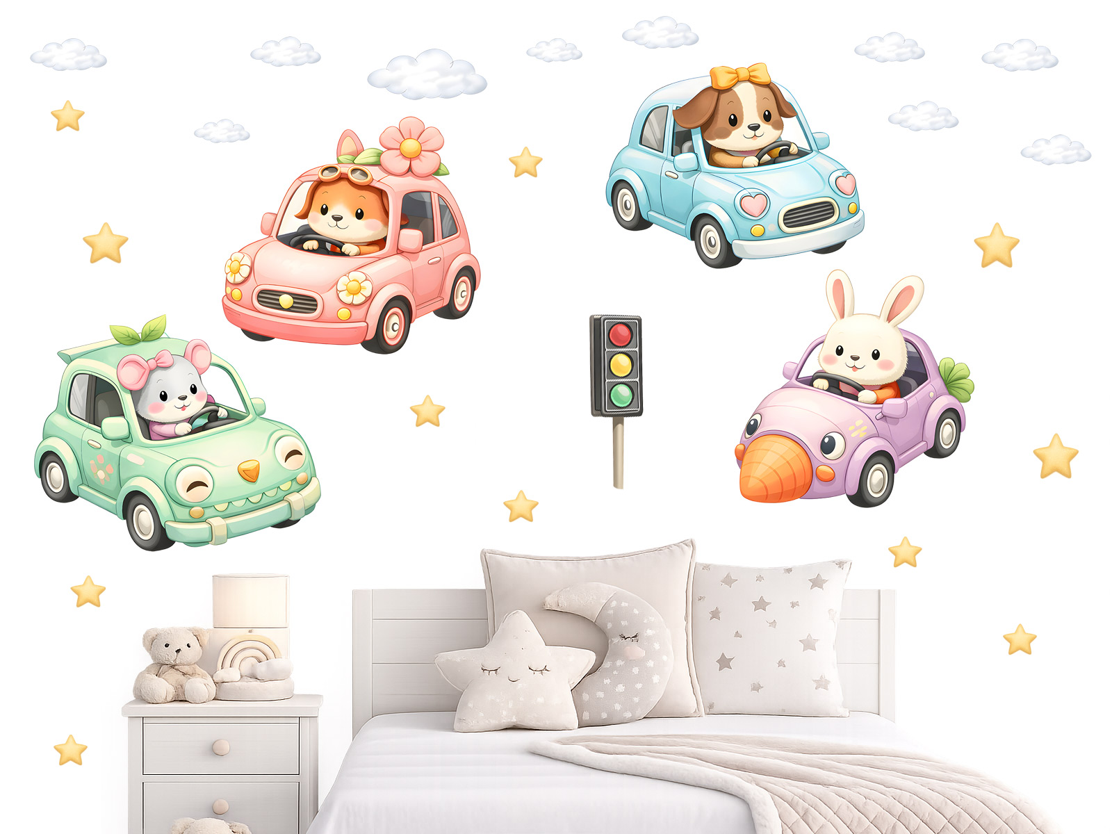 Roztomilá autíčka jsou hravé samolepky na zeď plné veselých zvířátek v barevných autech, které okamžitě rozzáří dětský pokoj. Jemné pastelové barvy, obláčky a hvězdičky vytvářejí lehkou a přátelskou atmosféru, ideální pro malé milovníky aut a dobrodružství. Samolepky se snadno aplikují a díky jednotlivým motivům si můžete rozložení přizpůsobit přesně podle prostoru. Skvěle se hodí nad postýlku, k hracímu koutku nebo nad psací stůl.