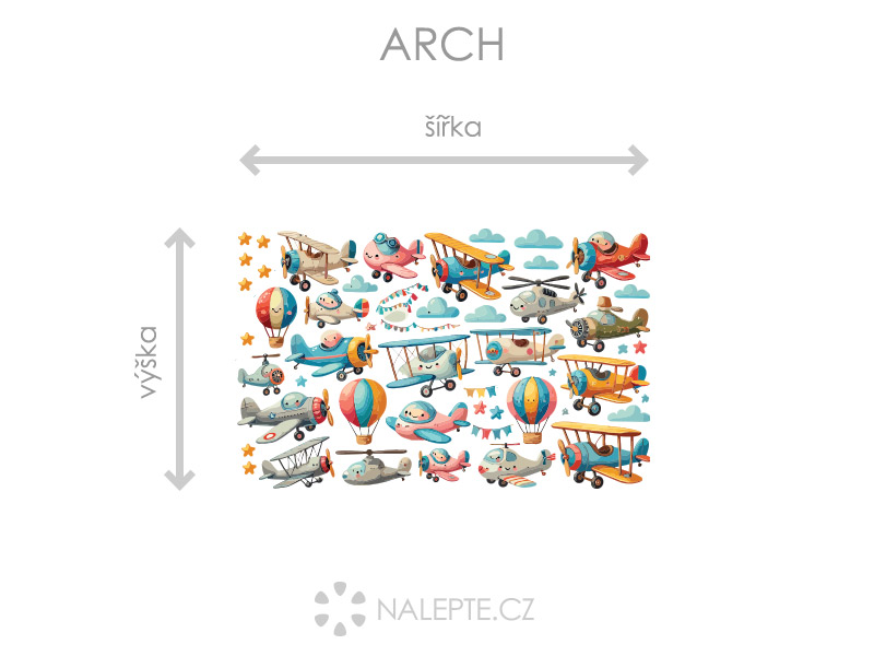 Arch = takto vám bude samolepka doručena. Každý prvek na archu je samostatná samolepka, jednotlivé části jednoduše od papírového podkladu odlepíte a nalepíte na zeď tak, aby složily výsledný motiv dle Vašich představ. Arch si můžete prohlédnout ve fotogalerii. Rozměr archu volíte v objednávce. Přehled předdefinovaných rozměrů (šířka x výška): a) arch 46 x 29 cm b) arch 75 x 47 cm c) arch 100 x 63 cm Je možné zvolit i libovolný vlastní rozměr archu pomocí posuvníku či klikání na "Větší", "Menší"