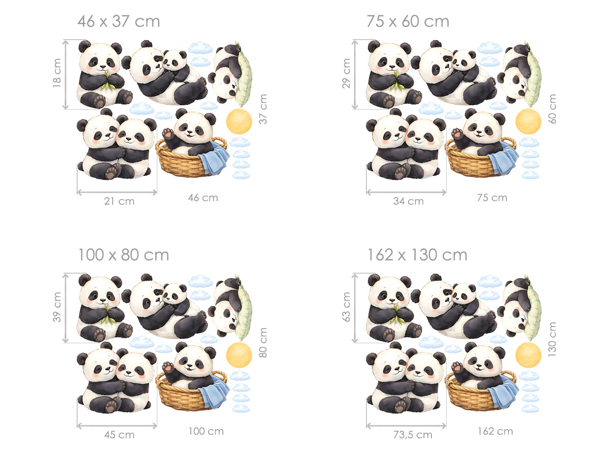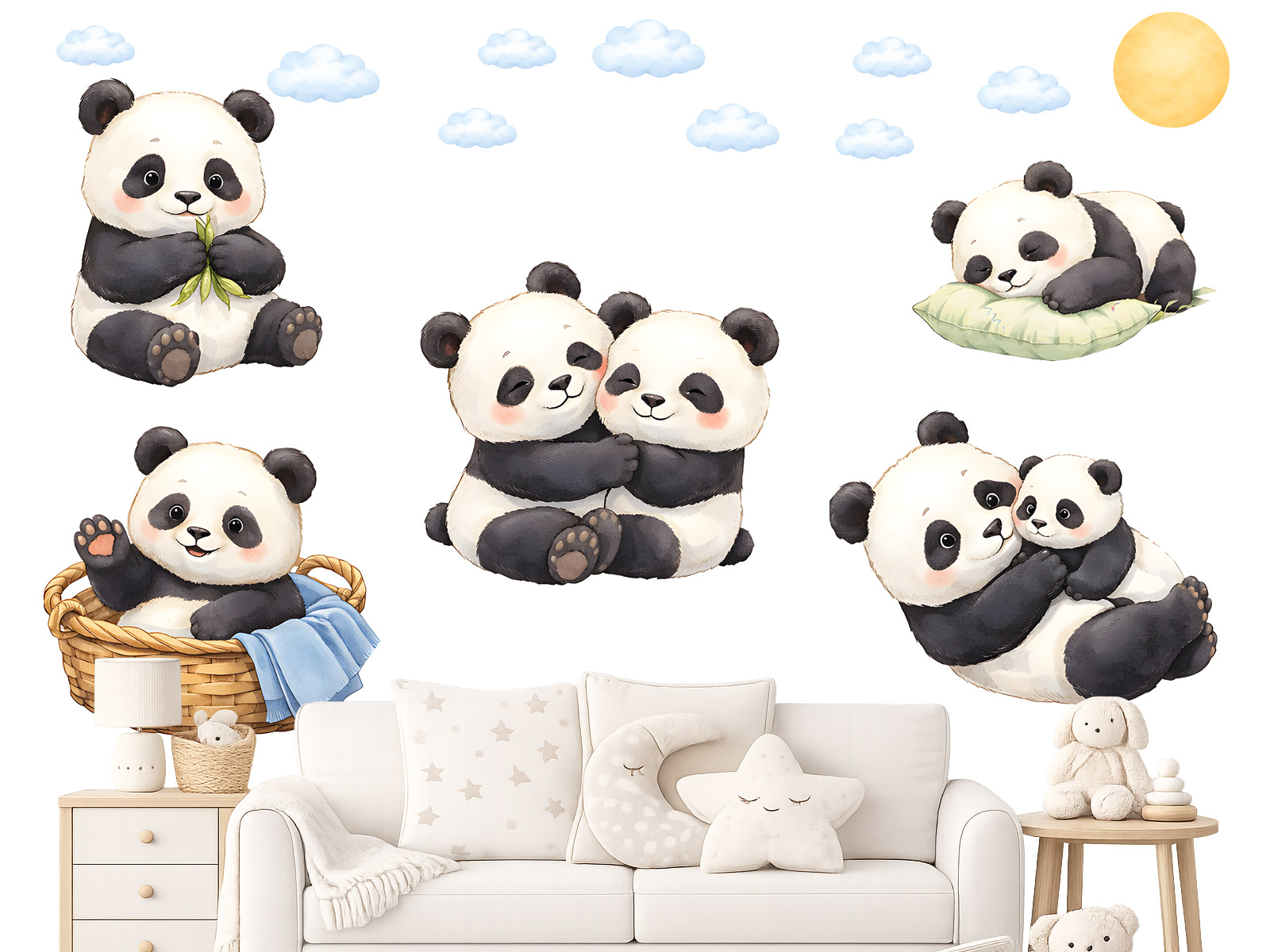 Samolepka na zeď Roztomilé pandy přináší do dětského pokoje něžnou a uklidňující atmosféru plnou lásky a pohody. Jemné akvarelové ilustrace pand působí velmi přátelsky a jsou ideální pro vytvoření klidného prostředí pro odpočinek i hraní. Pandy jsou zobrazeny v různých roztomilých situacích – při objímání, odpočinku i hraní, což dodává celé dekoraci živost a příběh. Jejich hebký vzhled a jemné pastelové odstíny krásně ladí s moderním dětským interiérem. Motiv doplňují drobné obláčky a sluníčko, které celé kompozici dodávají lehkost a harmonii. Jednotlivé prvky lze rozmístit podle vlastního prostoru a vytvořit si tak originální uspořádání na míru. Ideální dekorace pro všechny děti, které milují zvířátka a jemný, hřejivý design plný něhy.